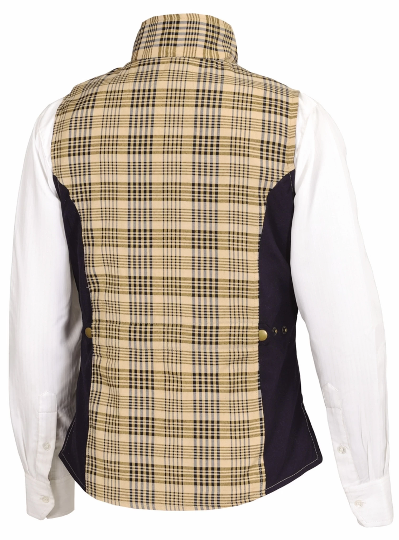 The Baker Ladies Select Vest features the classic Baker plaid as part of the main design. Concealed front pockets and adjustable snap waist cincher on the back have been added to give you a more form fitting silhouette. In addition, this vest also has side gussets for more freedom of movement in the saddle or for casual wear. The Baker Select vest is a lightweight, stylish and practical addition to your wardrobe for spring and fall.