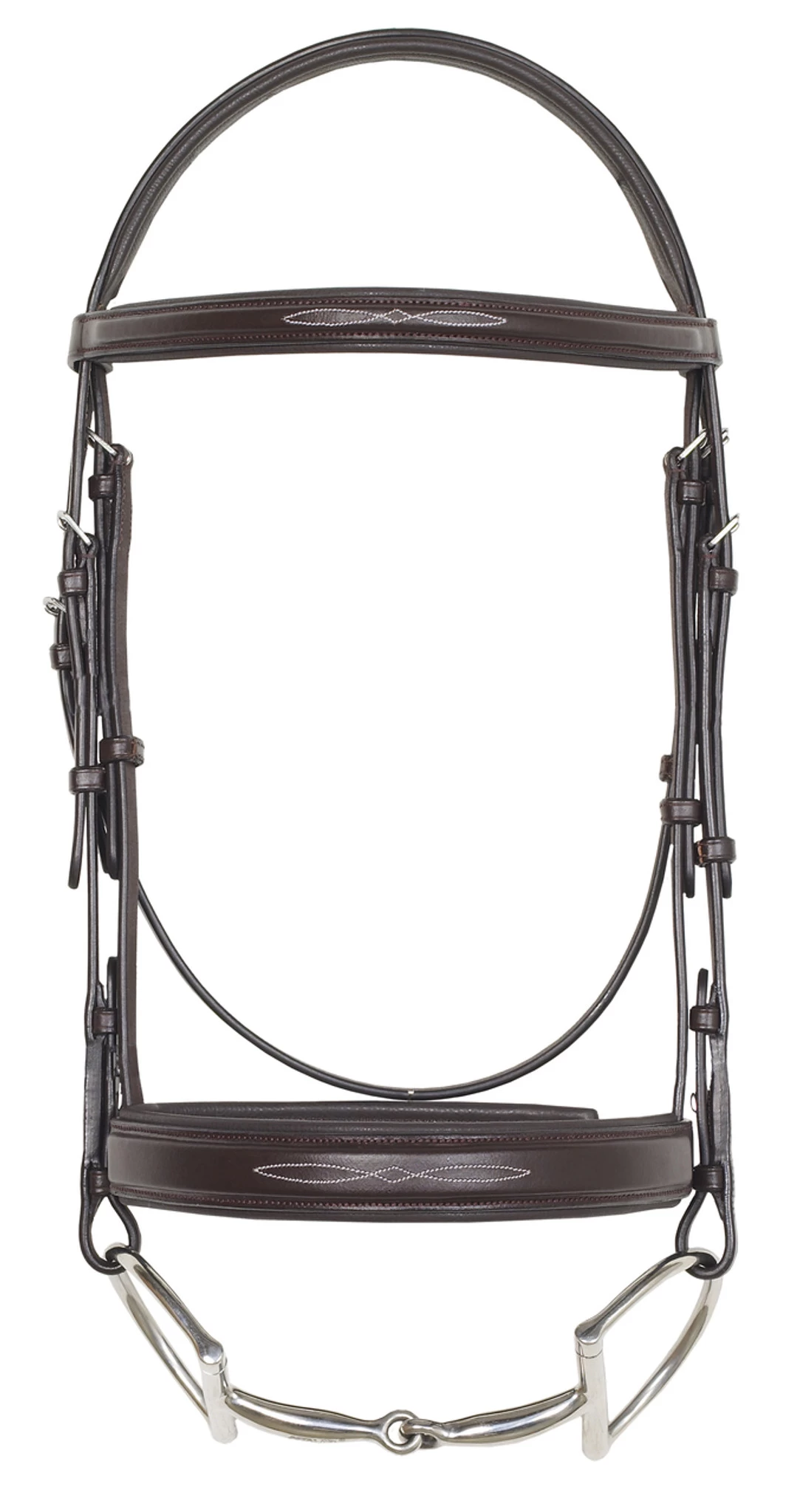 An affordable leather snaffle bridle with wide padded fancy stitched square raised browband and noseband. Padded Comfort Crown design with decorative stitching and 5/8″ laced reins.