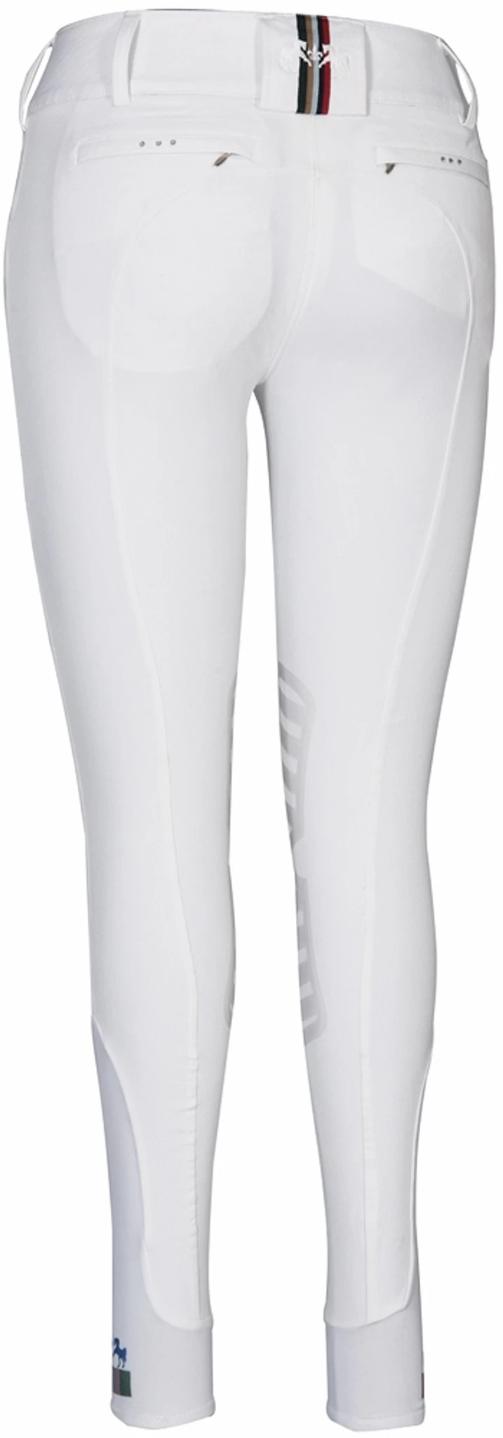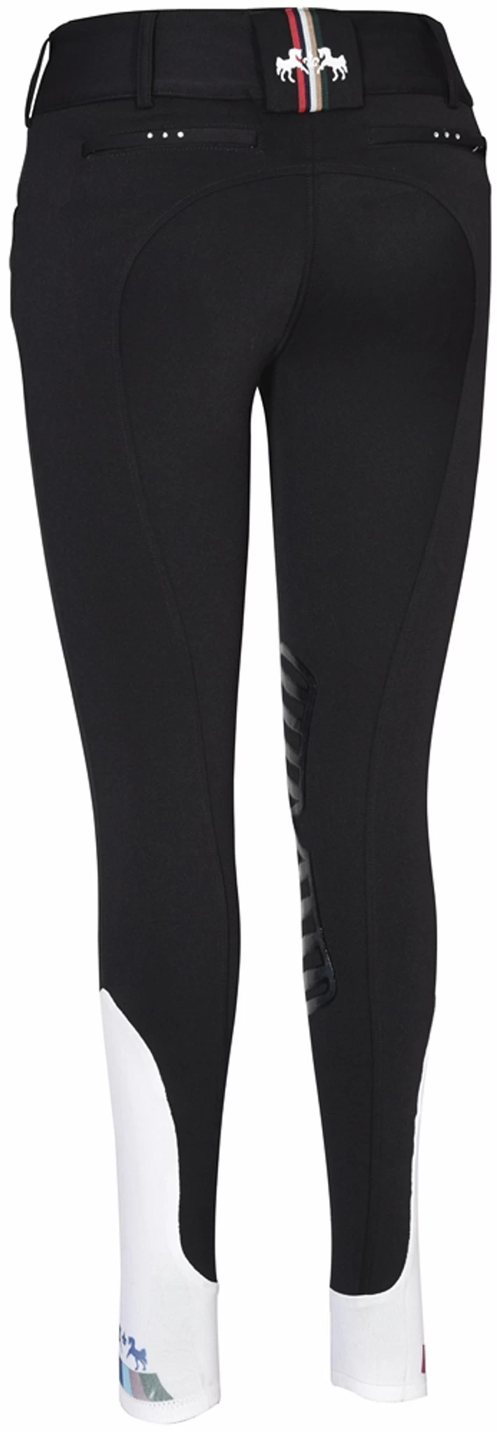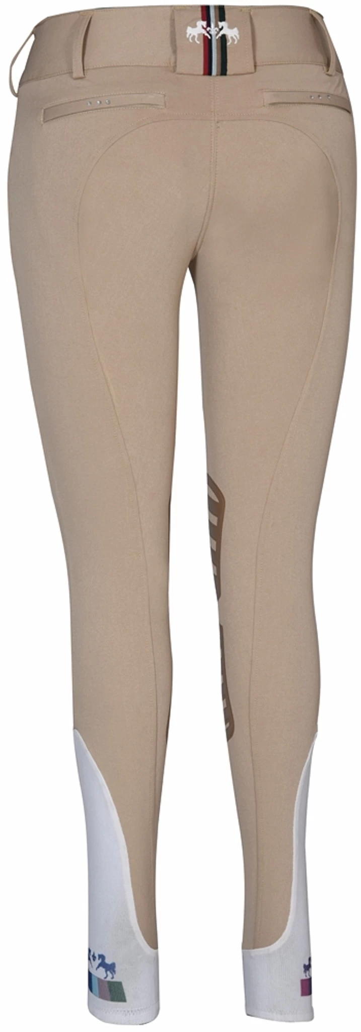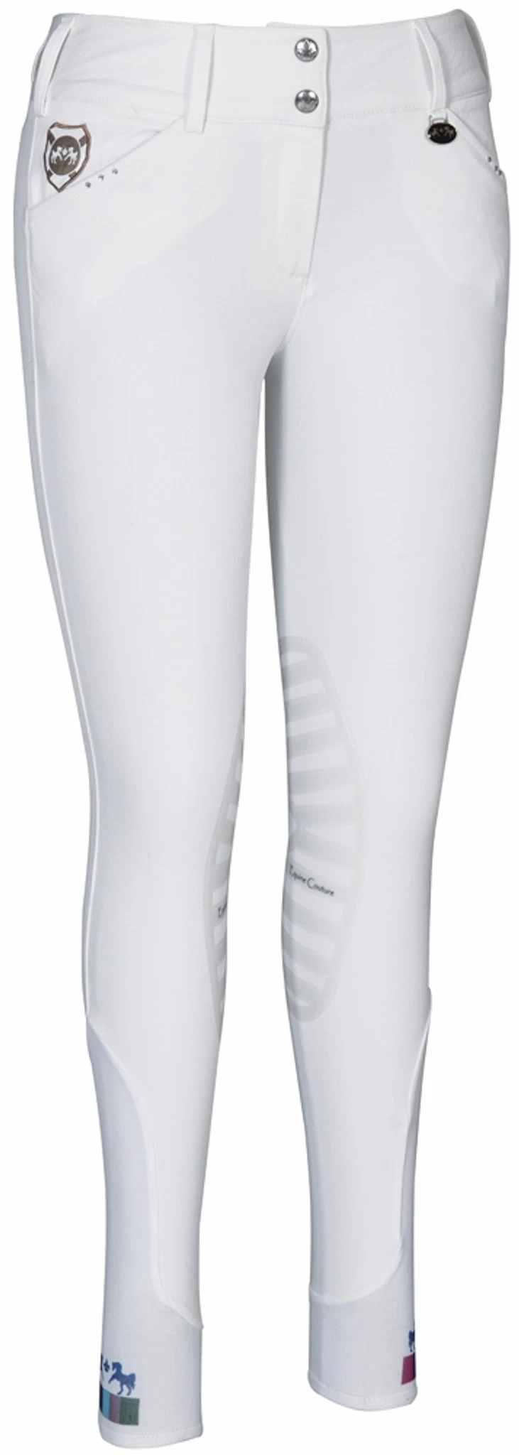 Subtle, yet elegant, these Fiona breeches from Equine Couture provide a modern twist to the classic breech look. Featuring innovative Coolmax™ blended fabric and a wide waistband style, these breeches are sure to keep you comfortable and looking great all day long. Silicone knee patches, Euro-seat style and contoured sock bottoms all provide both function and style. Front and rear pockets are adorned with small crystal details and provide convenient storage.