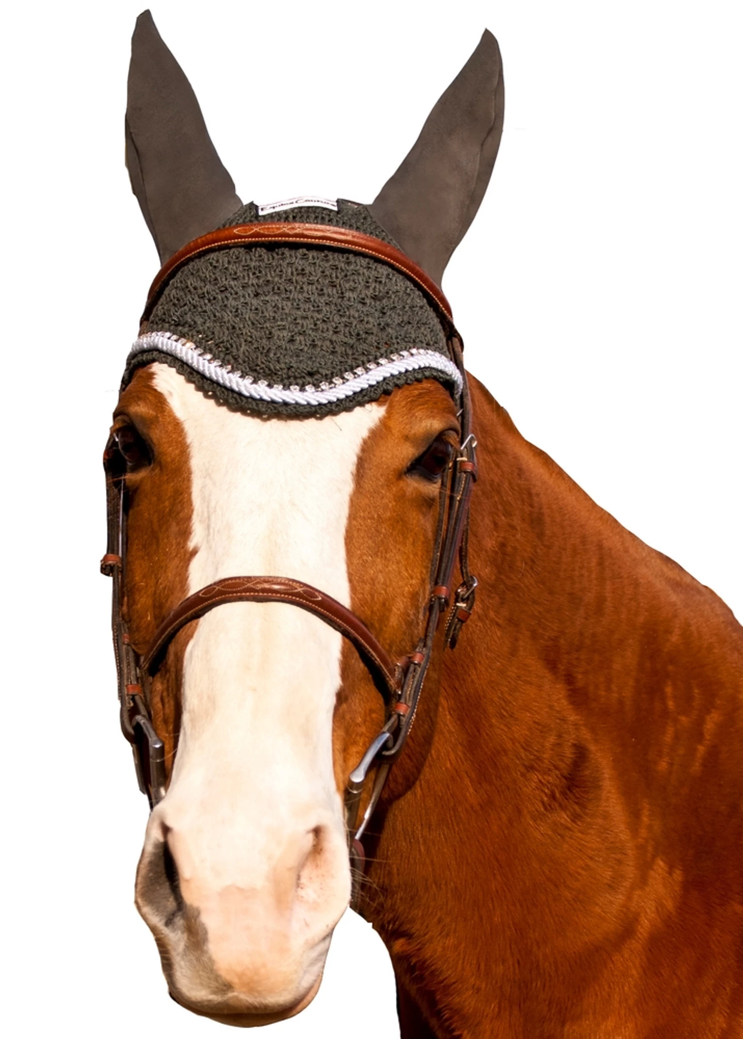 Keep your horse’s head and ears protected from irritating bugs while also having him/her look smart with this soft cotton, fly bonnet bordered with silver rope and crystals.