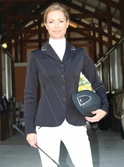 The Equine Couture Ladies Cara Short Sleeve Show Shirt is lightweight and great for summer showing in any discipline! Made from smooth micro polyester, the pull over style, with a hidden snap-up front, gives a polished show ring look, with a stock tie loop when needed. Cooling features include EquiCool technology for moisture wicking and UV protection. The stretch side panel ensures a great fit with additional breathability. Esthetic details include contrast stitching, a striped ribbon inside of the collar and cuffs, and an embroidered logo with crystals.