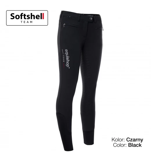 Exceptionally comfortable ladies’ riding breeches by Equishop Team. Made of softshell – a high-quality technical fabric, thanks to which they offer excellent ventilation on the one hand and wind protection on the other. The breeches have a full silicone seat, which guarantees better grip in the saddle. The material fits snugly on the body, thus ensuring freedom of movement and high levels of comfort not only during trainings.