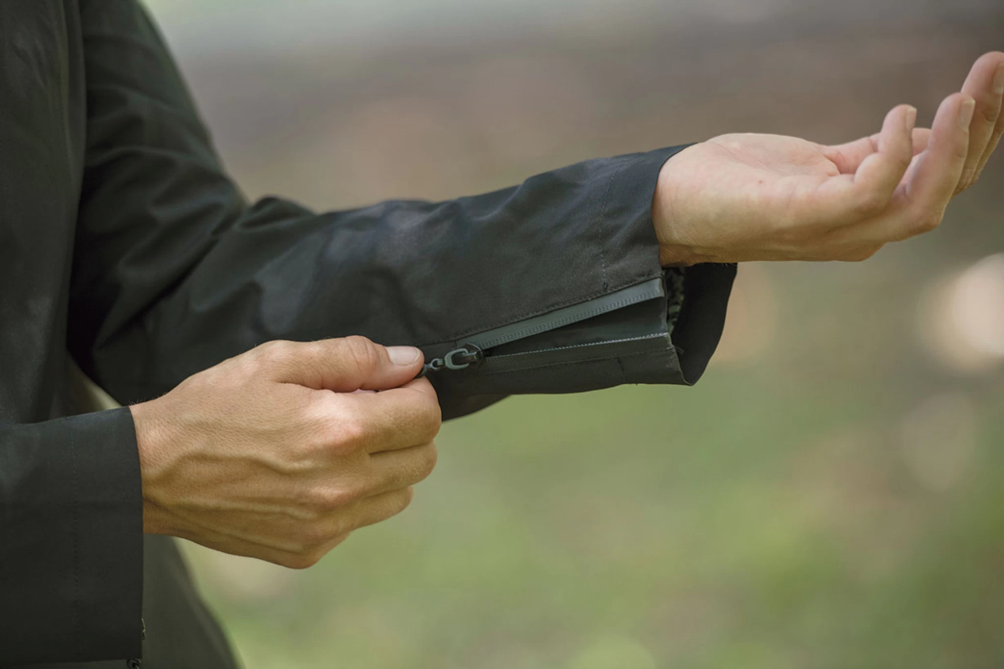 INCLUDES Zippered vents at the cuff, self-sealing exposed zipper pockets, hidden self-sealing zip front behind 4 black snaps, double back vent.