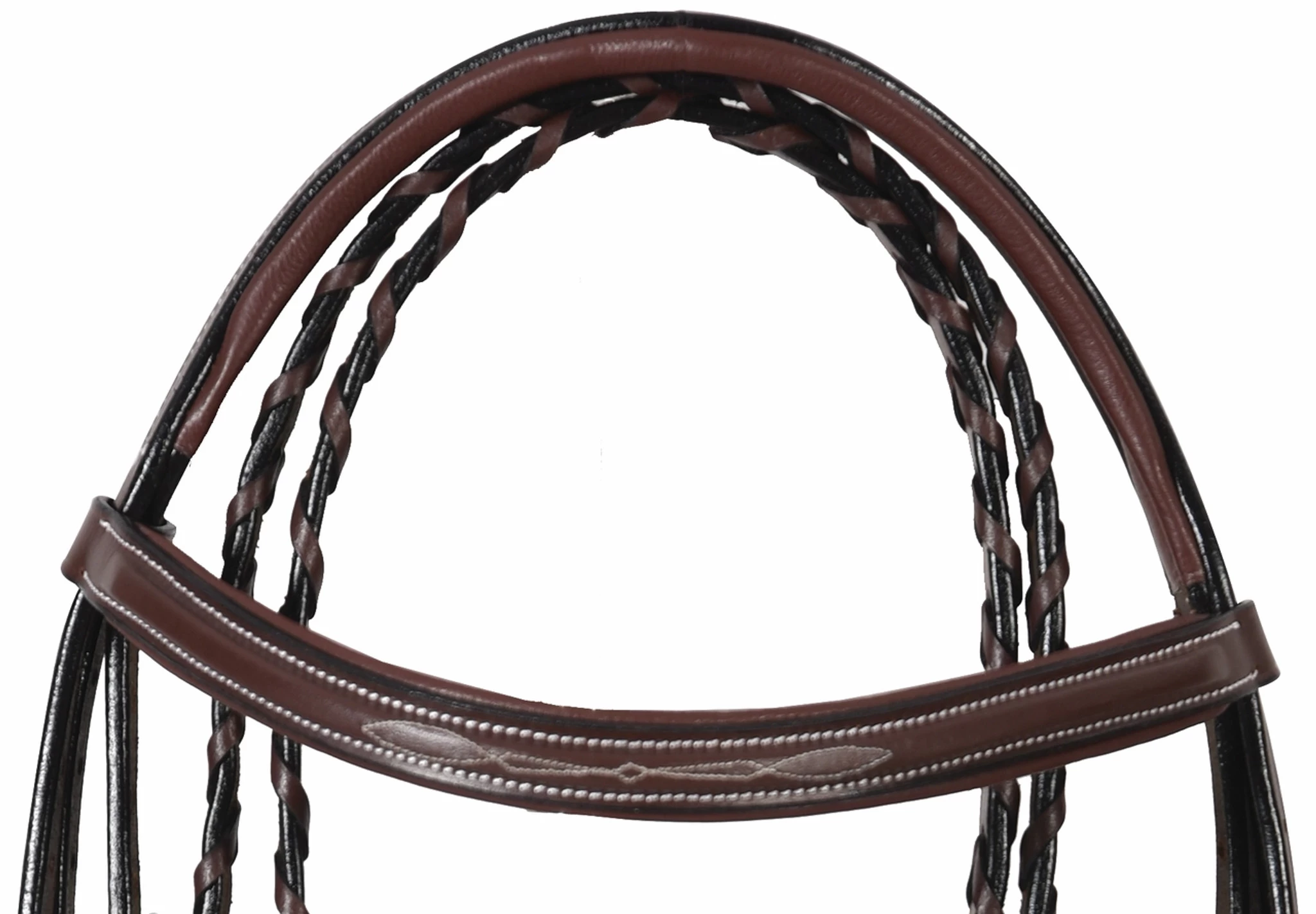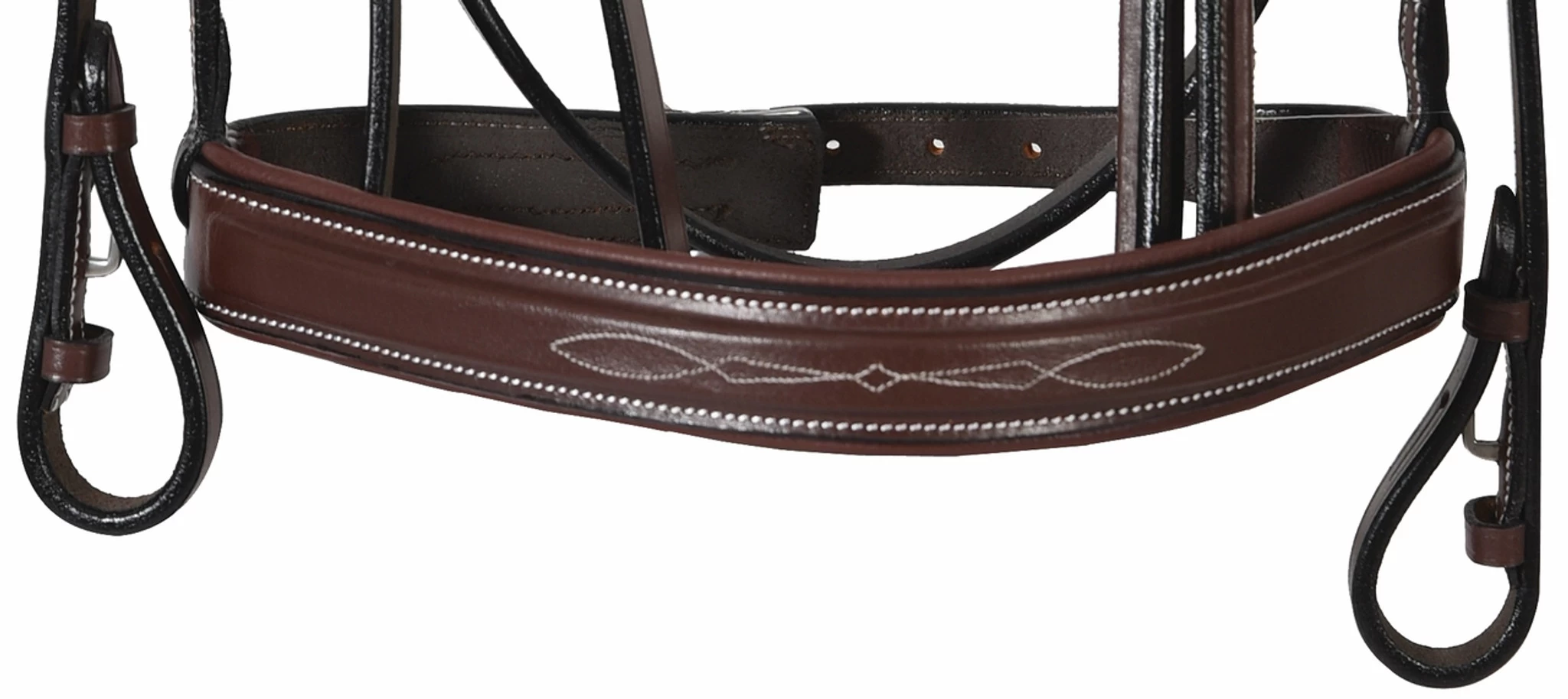 Your horse or pony will look beautiful and feel comfortable in this wide padded noseband mono-style bridle from HDR. Featuring a mono crown, fancy stitching on the browband, noseband, and reins, and a padded, contoured headstall, this bridle offers superior quality leather at an unbeatable price.