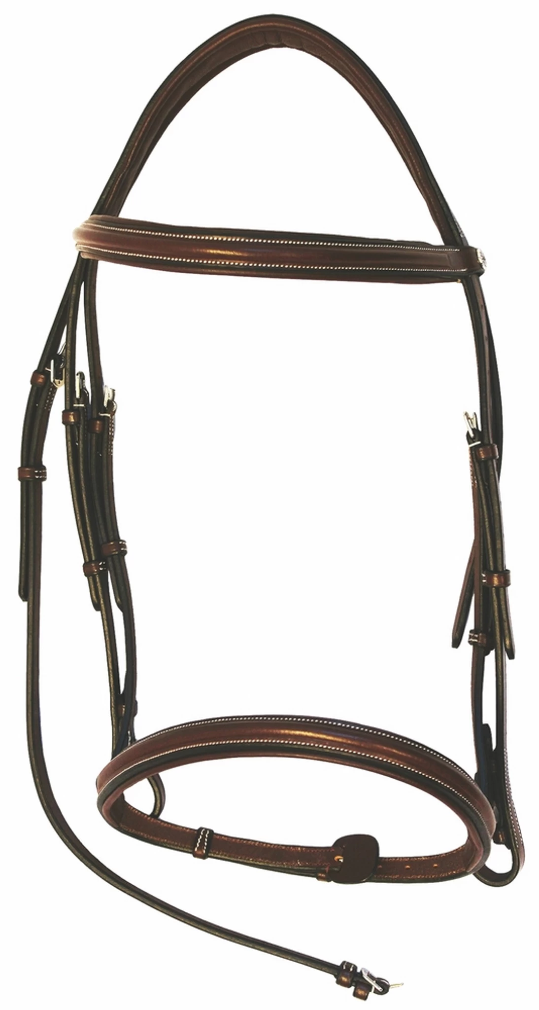 The Henri de Rivel, monocrown-style bridles offer superior quality leather at an affordable price. The Henri de Rivel Pro Mono Crown Padded Bridle with Laced Reins will certainly look elegant on your horse. The plain raised design is offered in classic colors and includes a padded contoured headstall as well as a padded noseband for added comfort. These snaffle bridles are a great choice for the hunters/jumpers/eventing divisions. Durable stainless steel hardware is included.