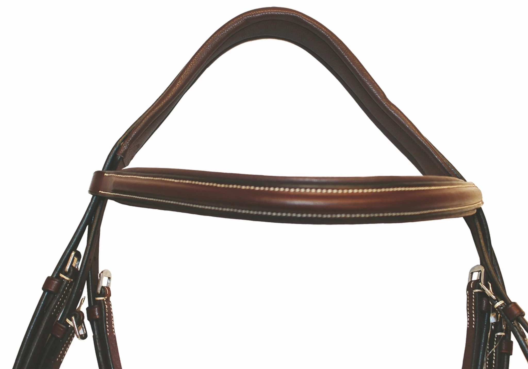 This professional figure 8 jumper bridle features an integrated crown design which combines crown piece and nose band hanger into a single unit. This bridle also features a padded, contoured headstall for comfort and style and comes complete with rubber reins.