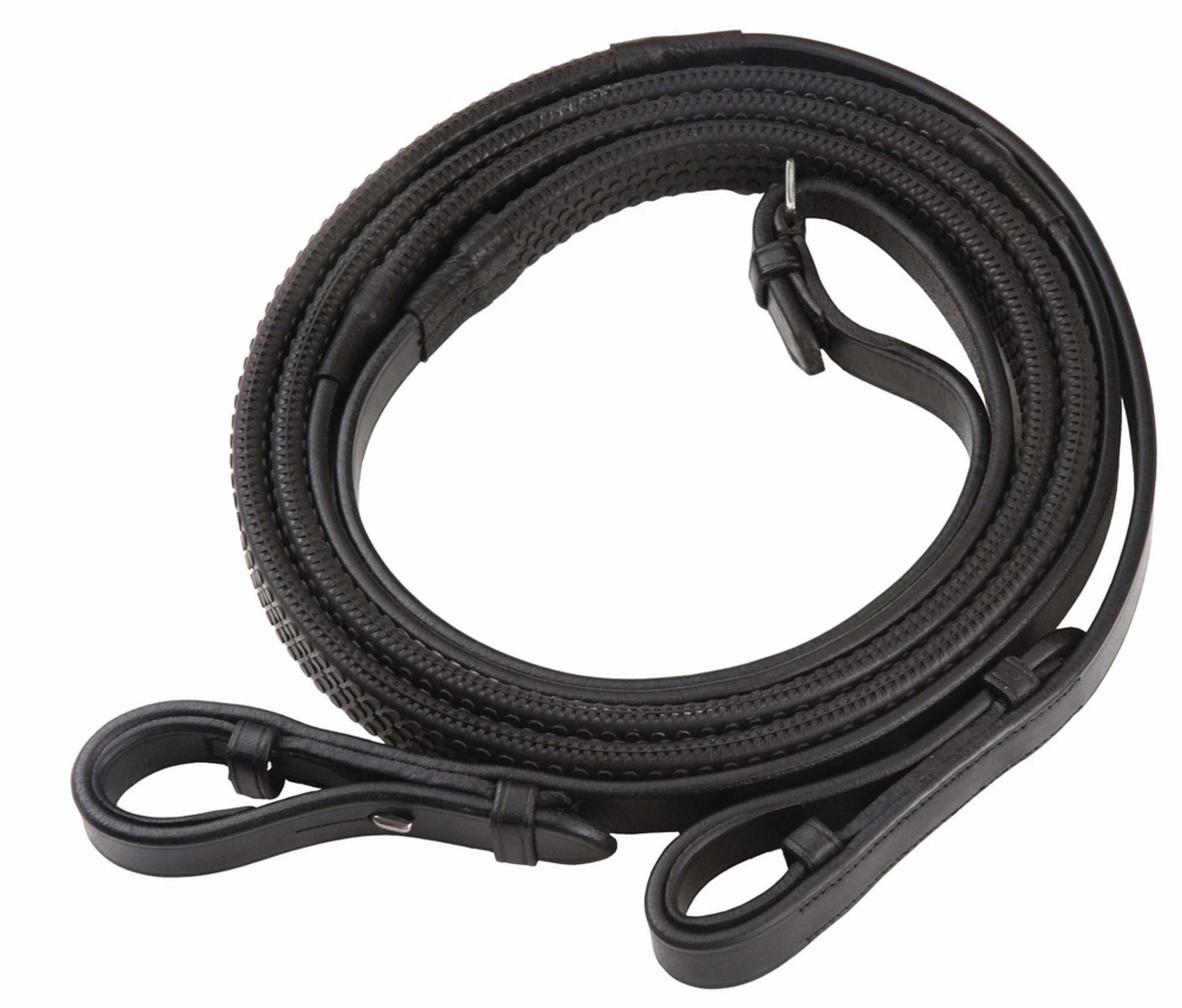 Durable HDR Rubber Reins with centered buckle provide the extra grip needed in wet conditions. These rubber reins have a textured feel and extra grip while allowing for elasticity compared to traditional leather reins.
