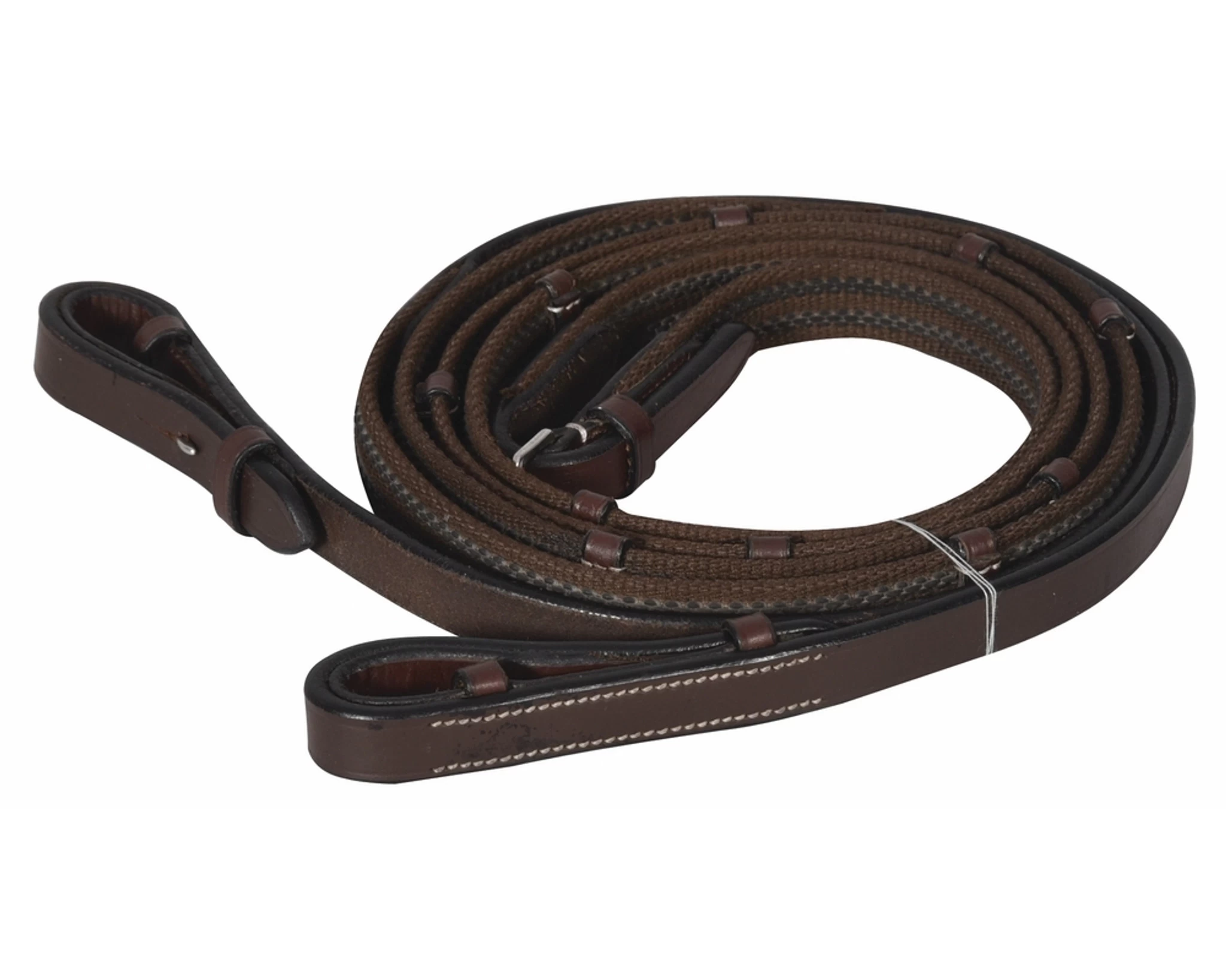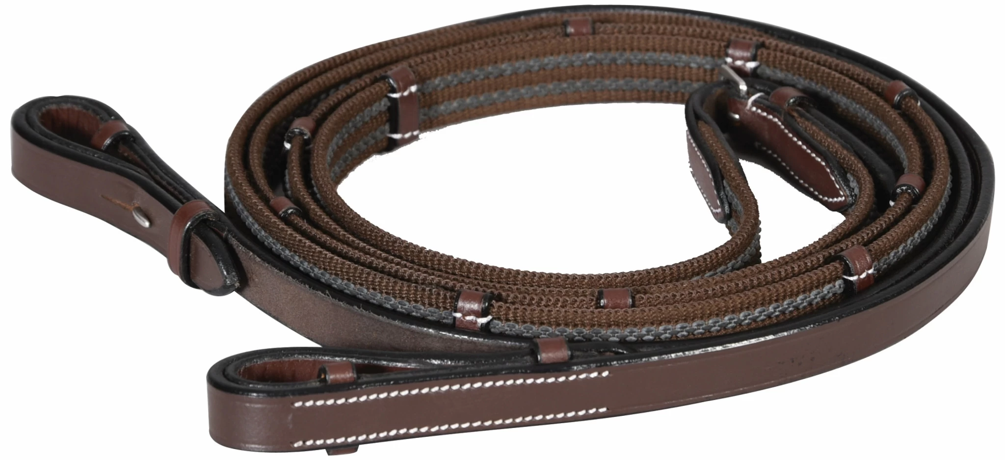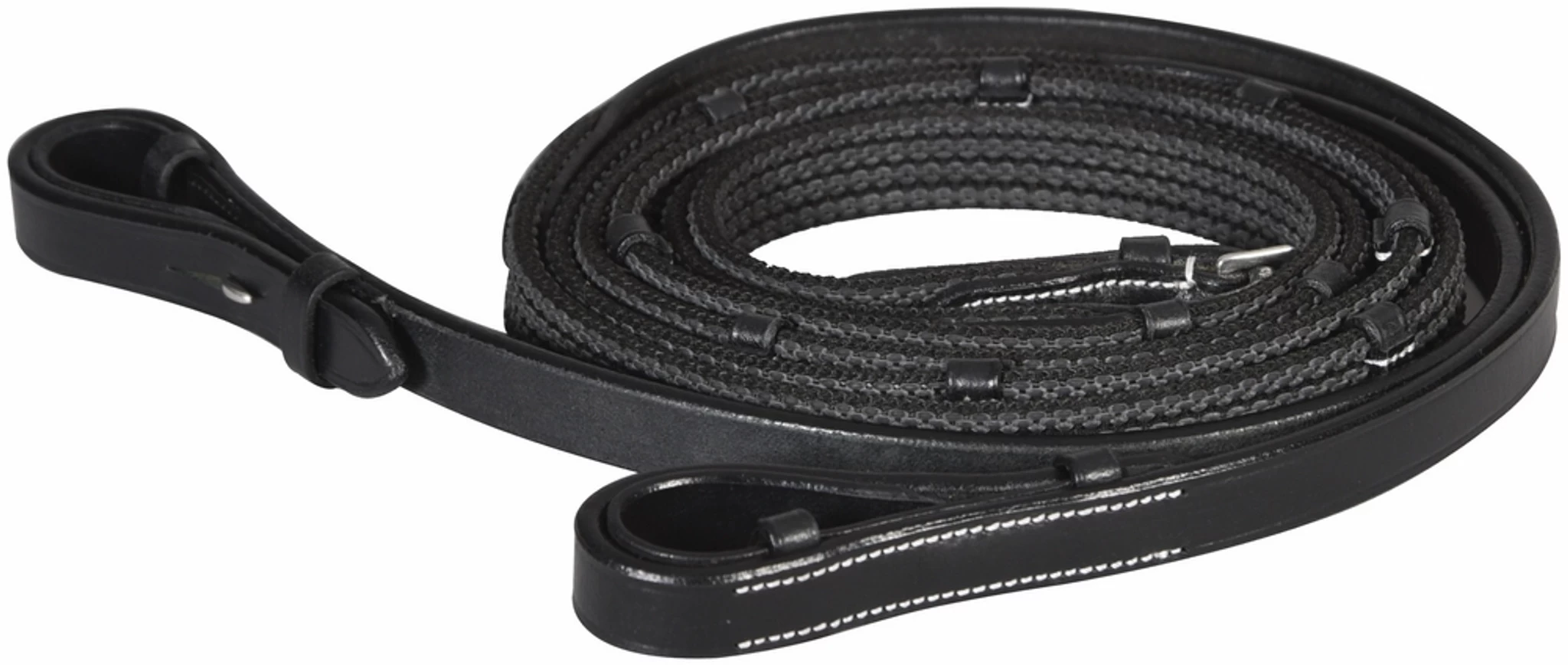 The HDR rubber-lined web rein gives riders the extra grip they need without the extra bulk. Made of polyester webbing with rubber woven throughout with leather hand stops and hook and stud ends. 5/8″ wide.