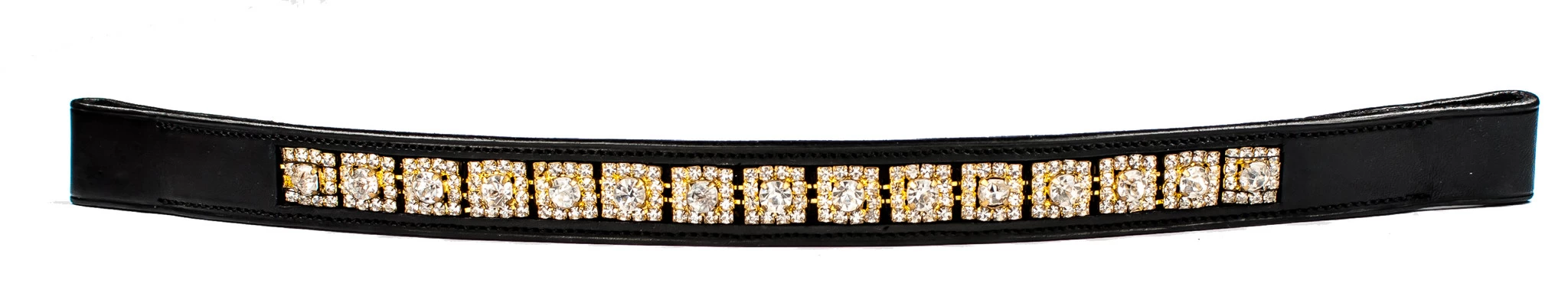 The HK Americana Flower Crystal Browband is a straight, unpadded, 1″ wide browband with clear rhinestones set in a square pattern around a larger, center clear rhinestone with gold colored settings. Made in durable and long lasting vegetable-tanned North American leather.
