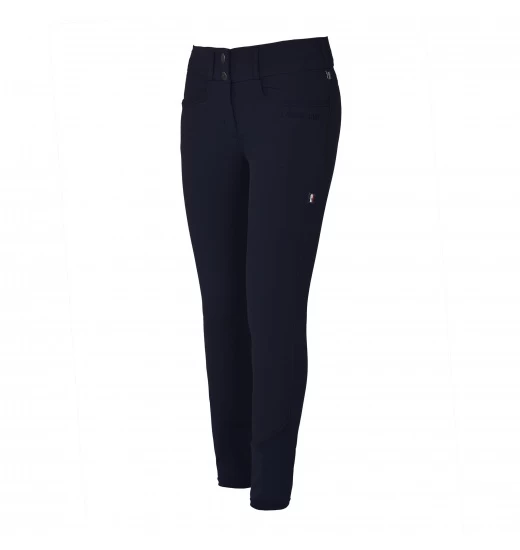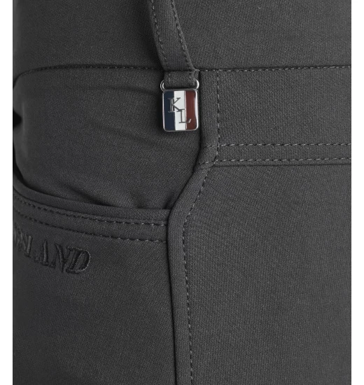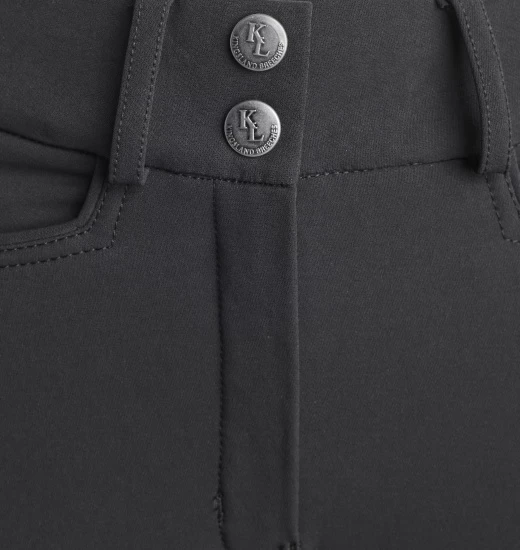 Ladies’ breeches with silicone knee grip. They have high waist and two buttons. The breeches are made of the highest-quality elastic material that stretches in all four ways. Waterproof, they do not absorb dirt or dust and are breathable. For maximal comfort, their legs have lycra at the bottom. These breeches are decorated with a Kingsland inscription by the left pocket and a small logo badge.