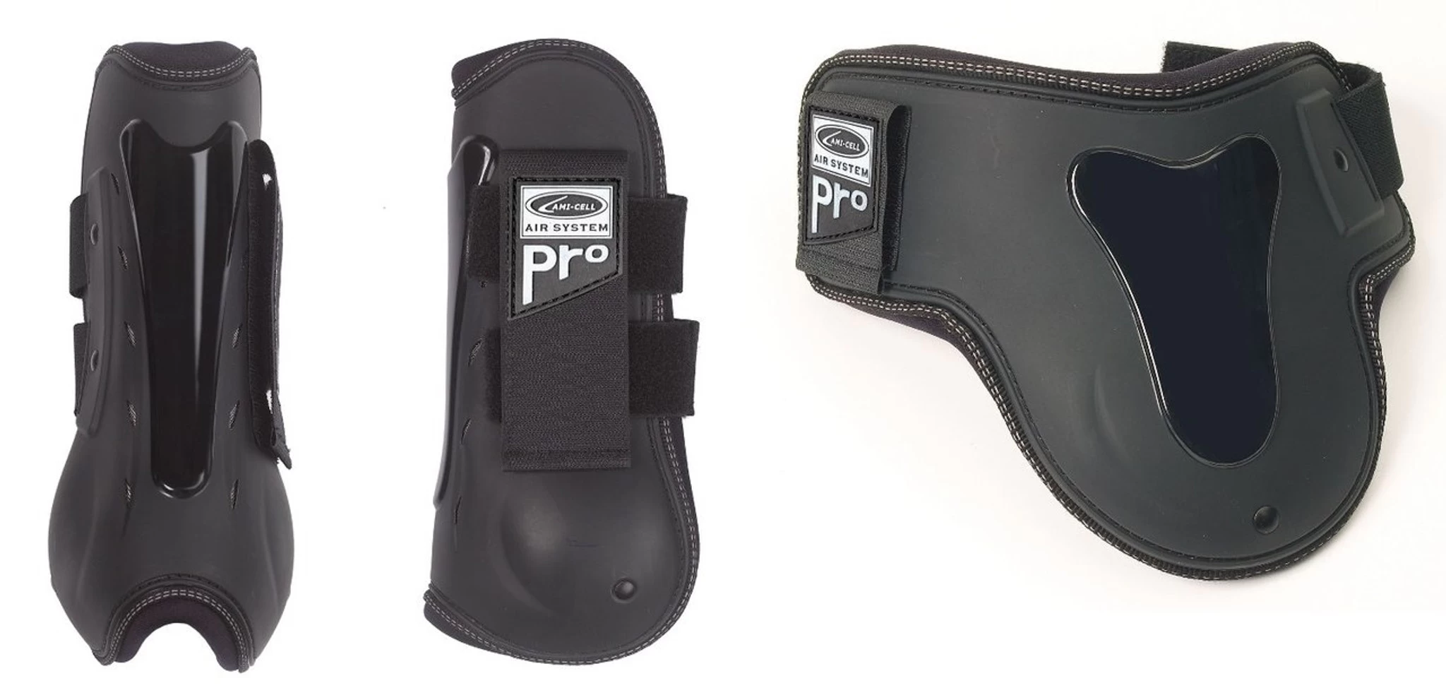 New lightweight leg protection from Lami-Cell! These molded open-front tendon boots and fetlock boots feature a tough outer shell that protects against strike and knock injuries. They feature high-tech perforated foam padding with air vents around the strike pads, reducing sweat build-up and keeping the leg cool. Elasticized lock straps for added security, and soft neoprene lining for added comfort. Set includes a pair of tendon boots and a pair of fetlock foots.