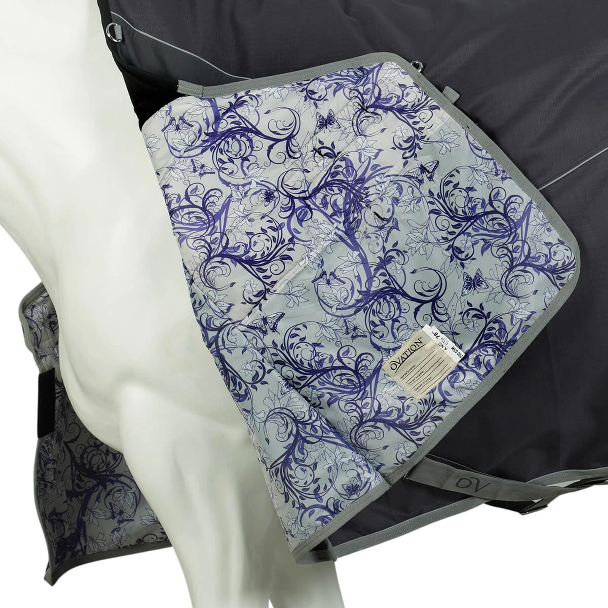 The Ovation 1200D Turnout Blanket is made of 1200D waterproof/breathable ripstop poly, printed nylon lining, modified mid neck with flex gusset to prevent rubbing, dee rings for optional neck cover attachment, Exceler™ snap front closure, criss-cross surcingles, relective piping, large umbrella tail flap, neoprene padded adjustable elastic leg straps.