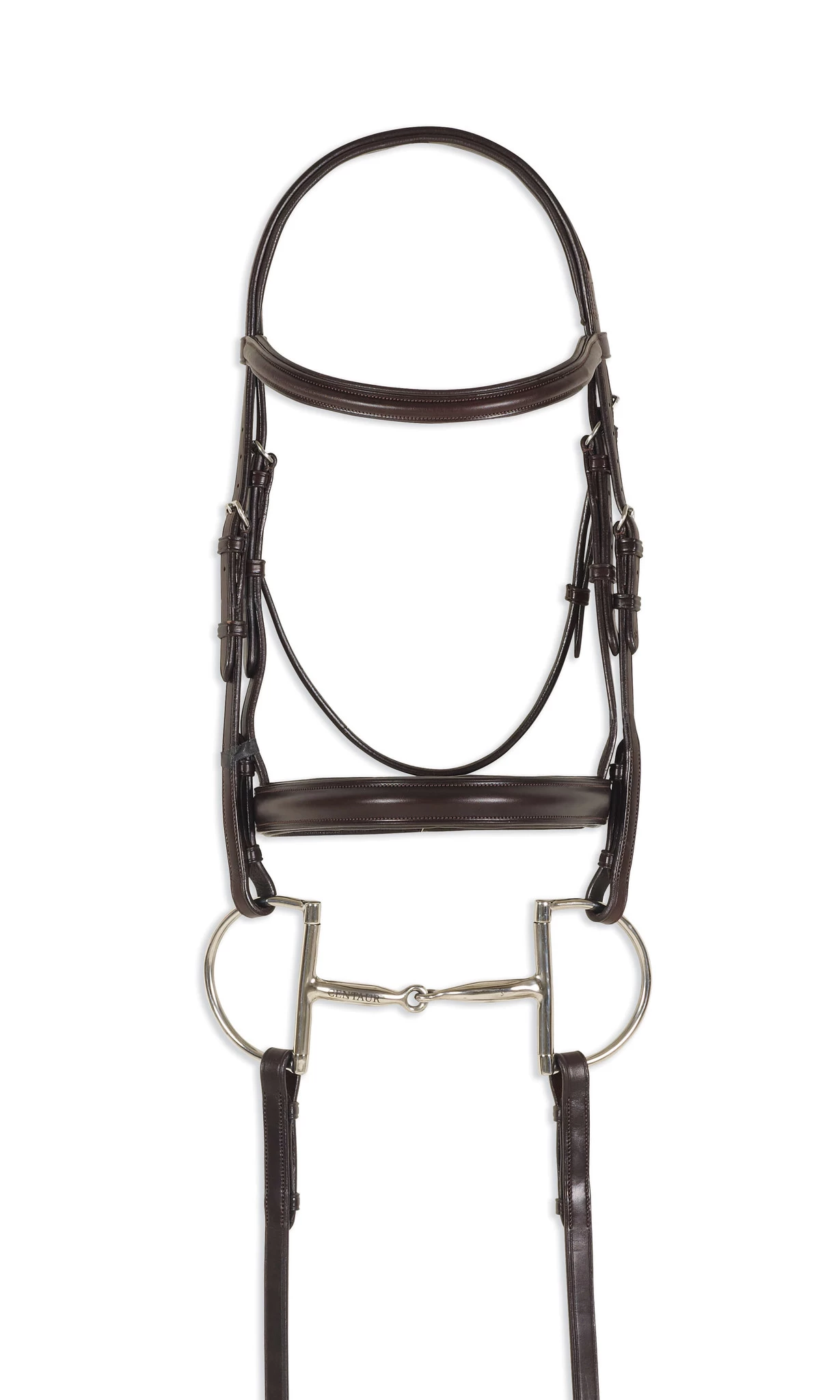 The Ovation Breed Collection Bridle for Quarter horses features carefully selected bridles that are appropriately sized and styled for the unique features of the Quarter horse. Crafted from hand finished full grain vegetable-tanned leather with a lustrous classic finish. With 5/8″ padded browband, 7/8″ padded noseband and 5/8″ x 66″ laced reins.