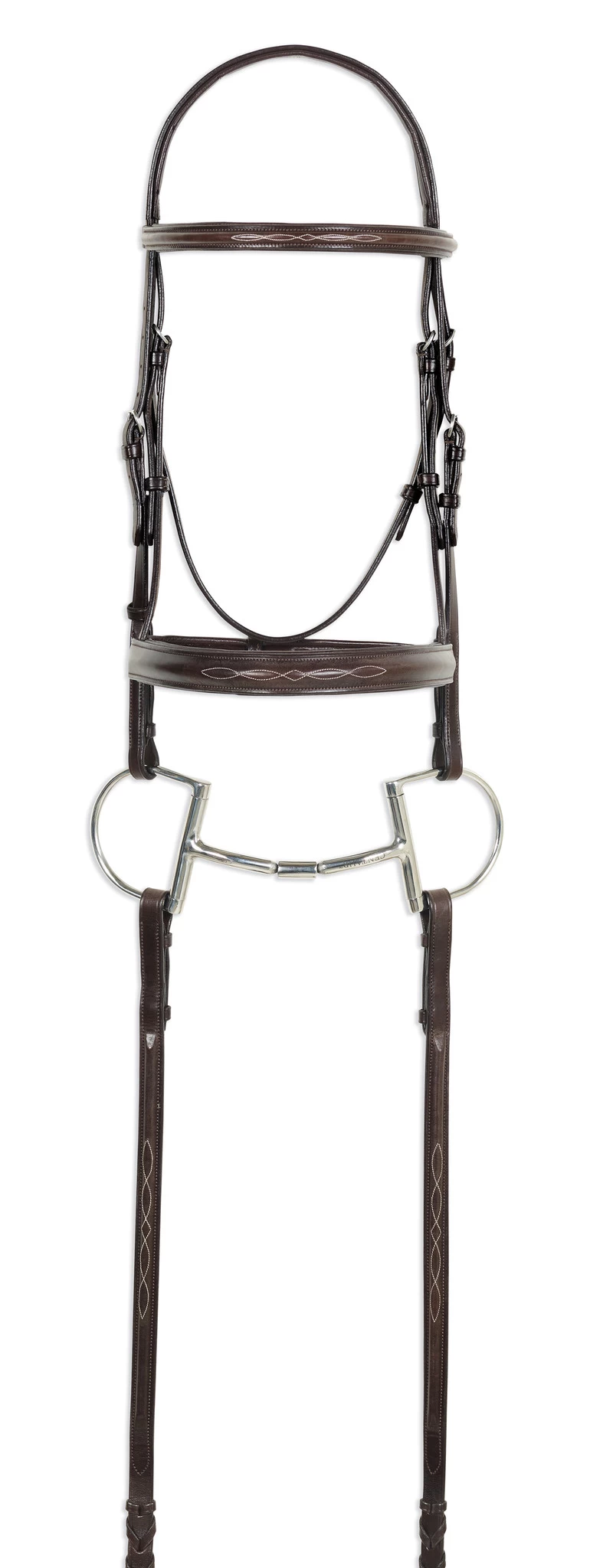 This Ovation fancy bridle features fine, supple Argentine leather with tight, even stitching. Monocrown design alleviates poll pressure. Finished with beeswax for suppleness but will still take oil. 1 1/4″ wide padded noseband. With 5/8″ x 54″ laced reins.