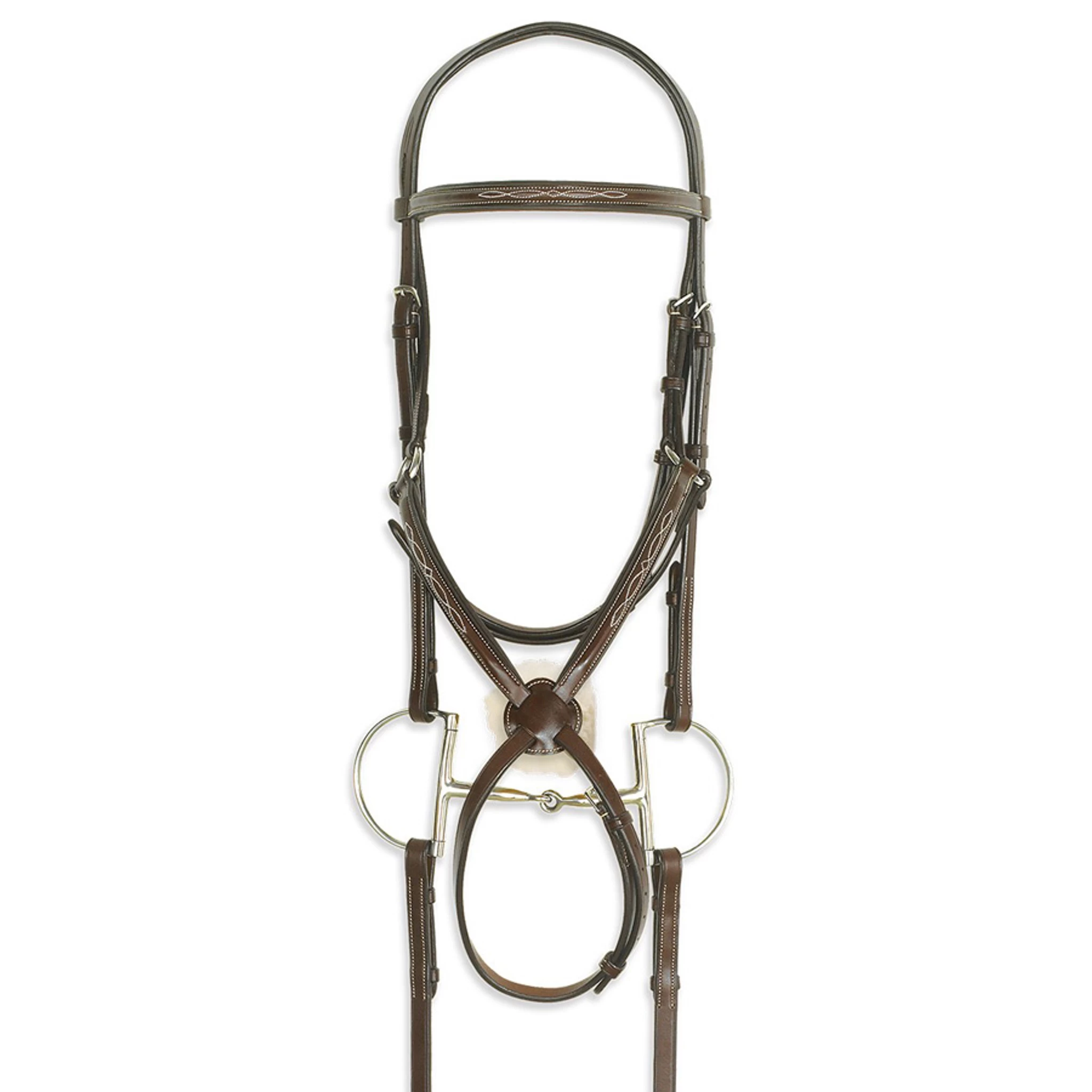 The Ovation Figure 8 Comfort Crown Bridle features fine, supple leather with tight, even stitching and a monocrown design alleviates poll pressure. The rubber reins prevent slipping in wet weather. Finished with beeswax for suppleness but will still take oil. Perfect for eventing or show jumping.
