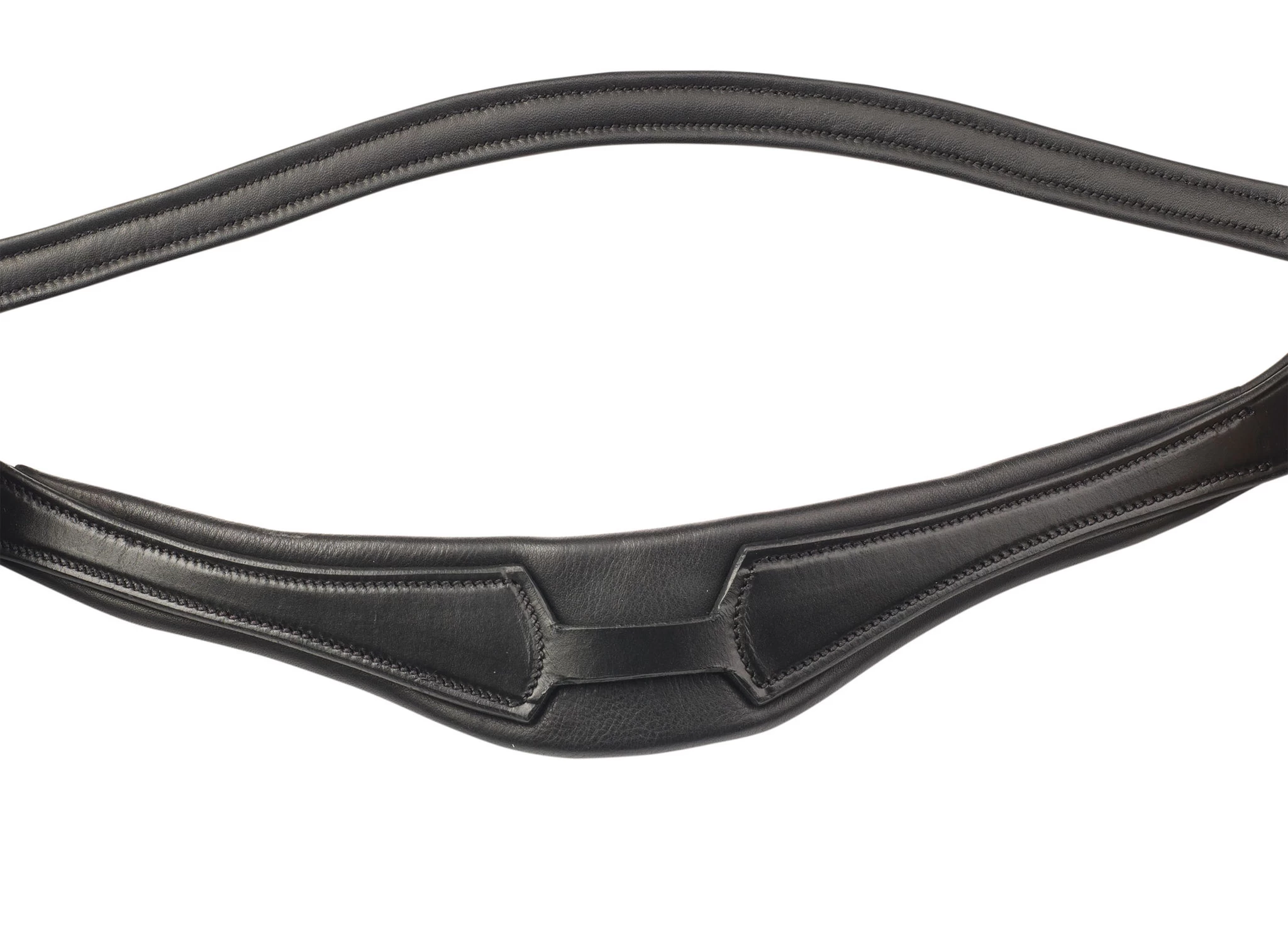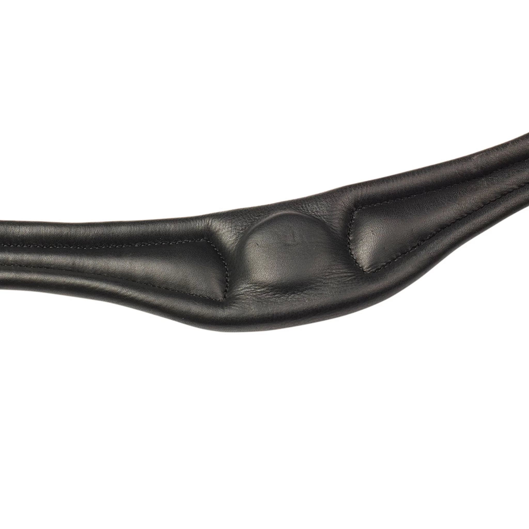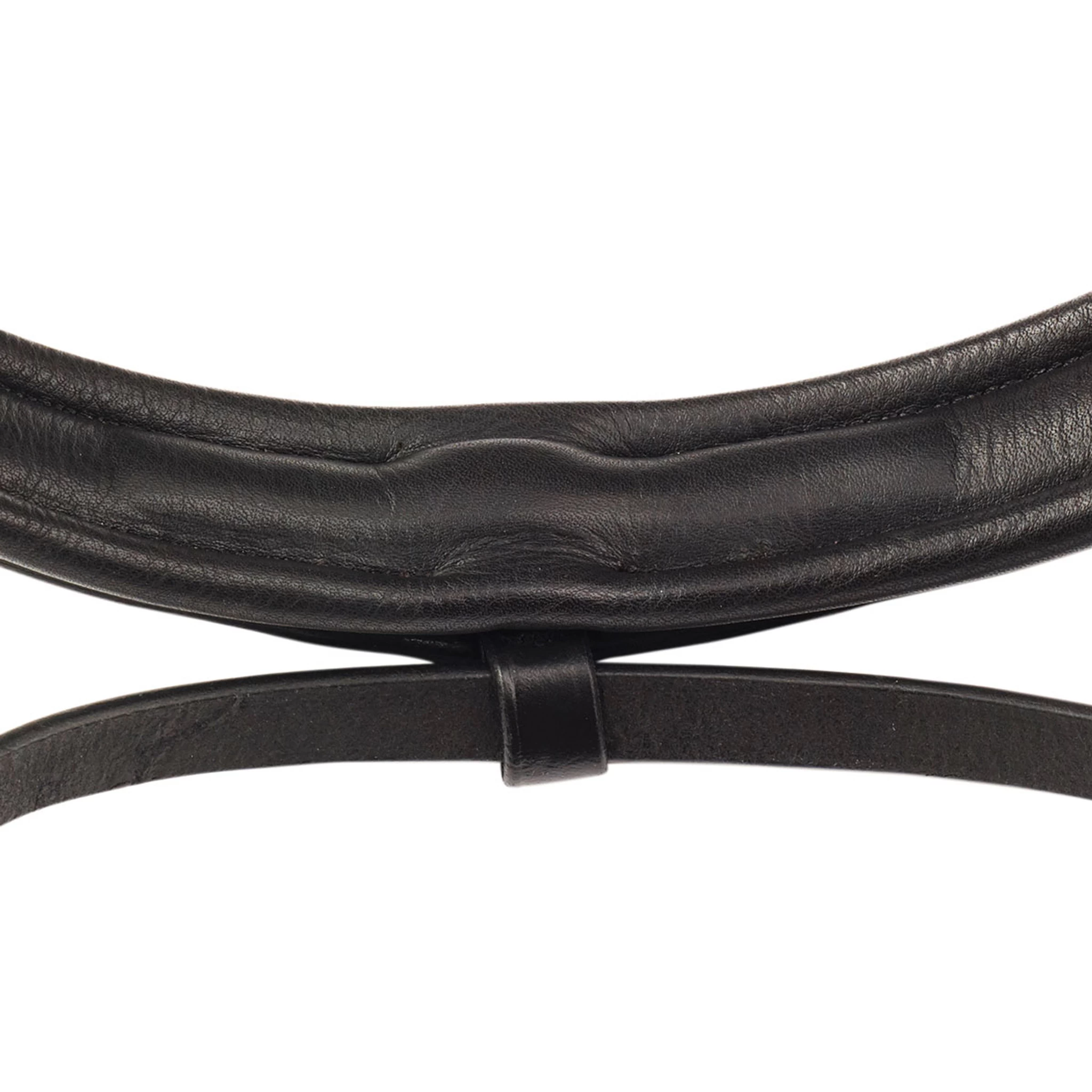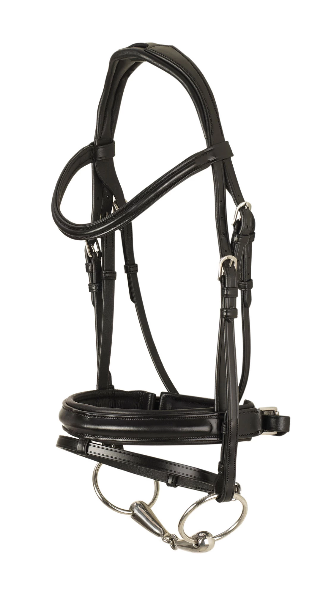 The Dortmund Anatomic Dressage Bridle features a 5/8” curved padded browband, and a 1 3/8” padded crank noseband with removable flash. Less reins.