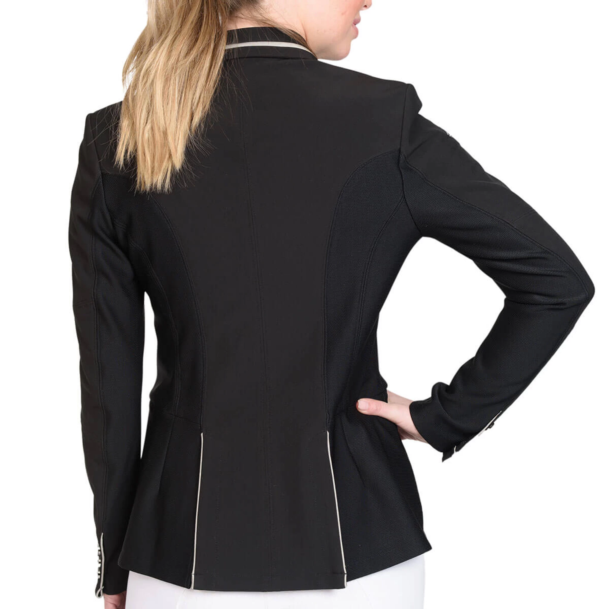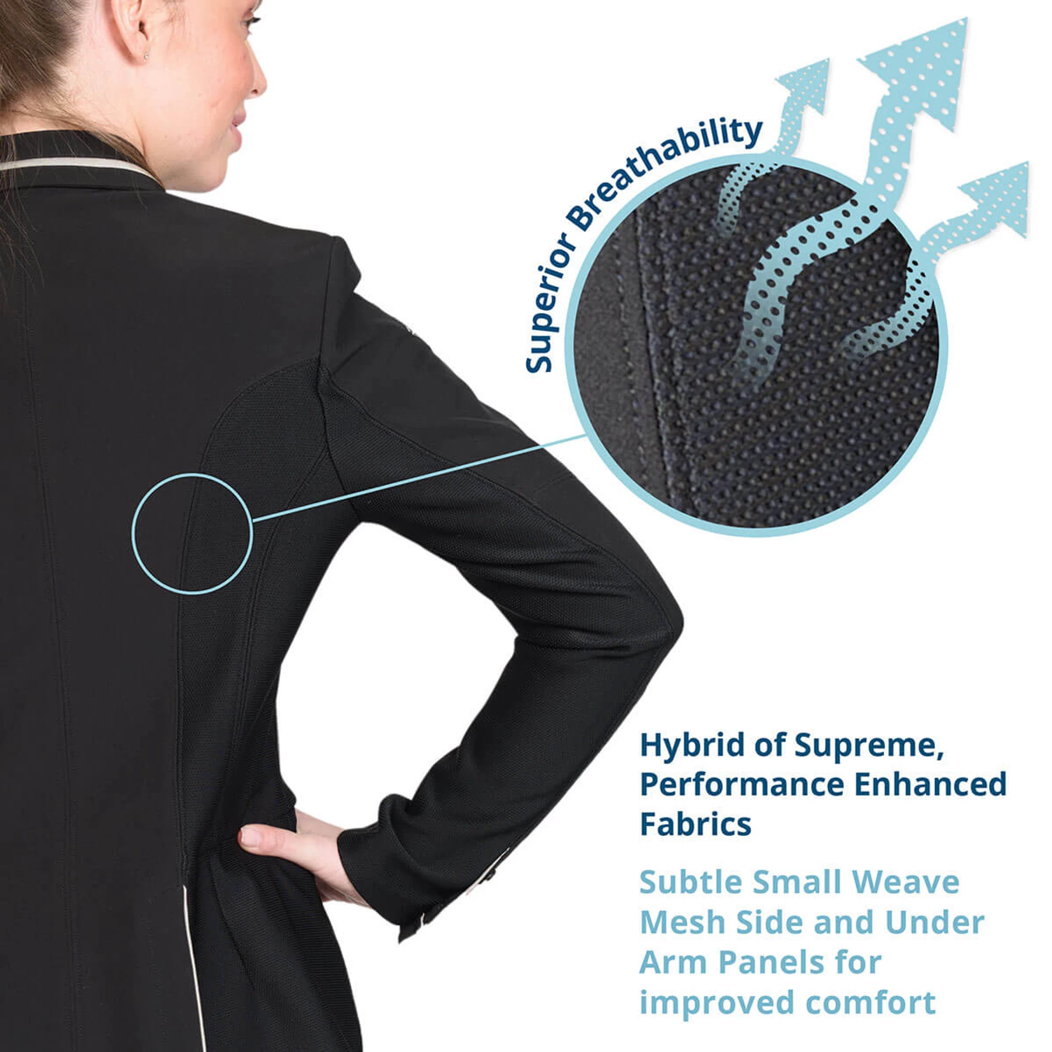 The Ovation Ladies Hybrid Euro Show Coat is a European inspired, classically designed, 4 button show coat made with a hybrid of supreme fabrics for enhanced performance. The front panels are made in a beautiful woven fabric and combined with subtle small weave mesh side and under arm panels for improved comfort. Front hidden zip pockets for a clean look. Silver satin contrast collar and back vent piping for a touch of European flare. Machine washable.