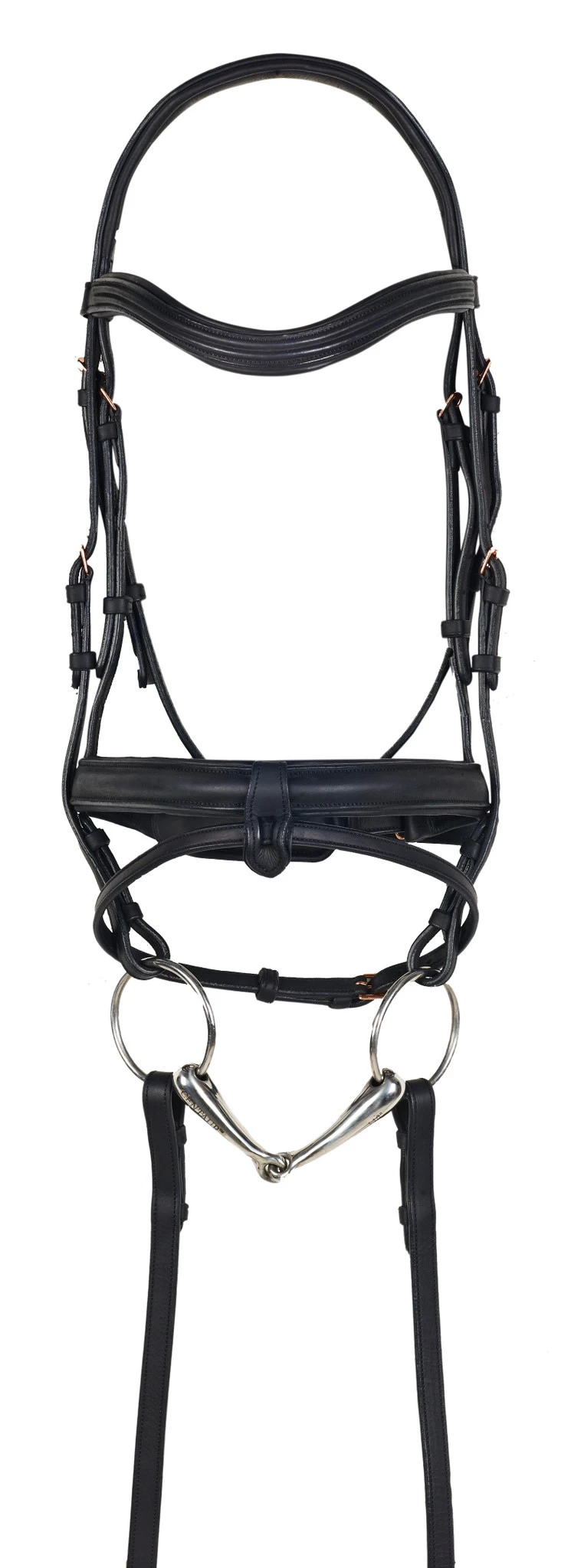 This dressage snaffle bridle is padded and features rosegold hardware and a padded crank noseband with flash. Comes with 5/8″ rubberized reins.