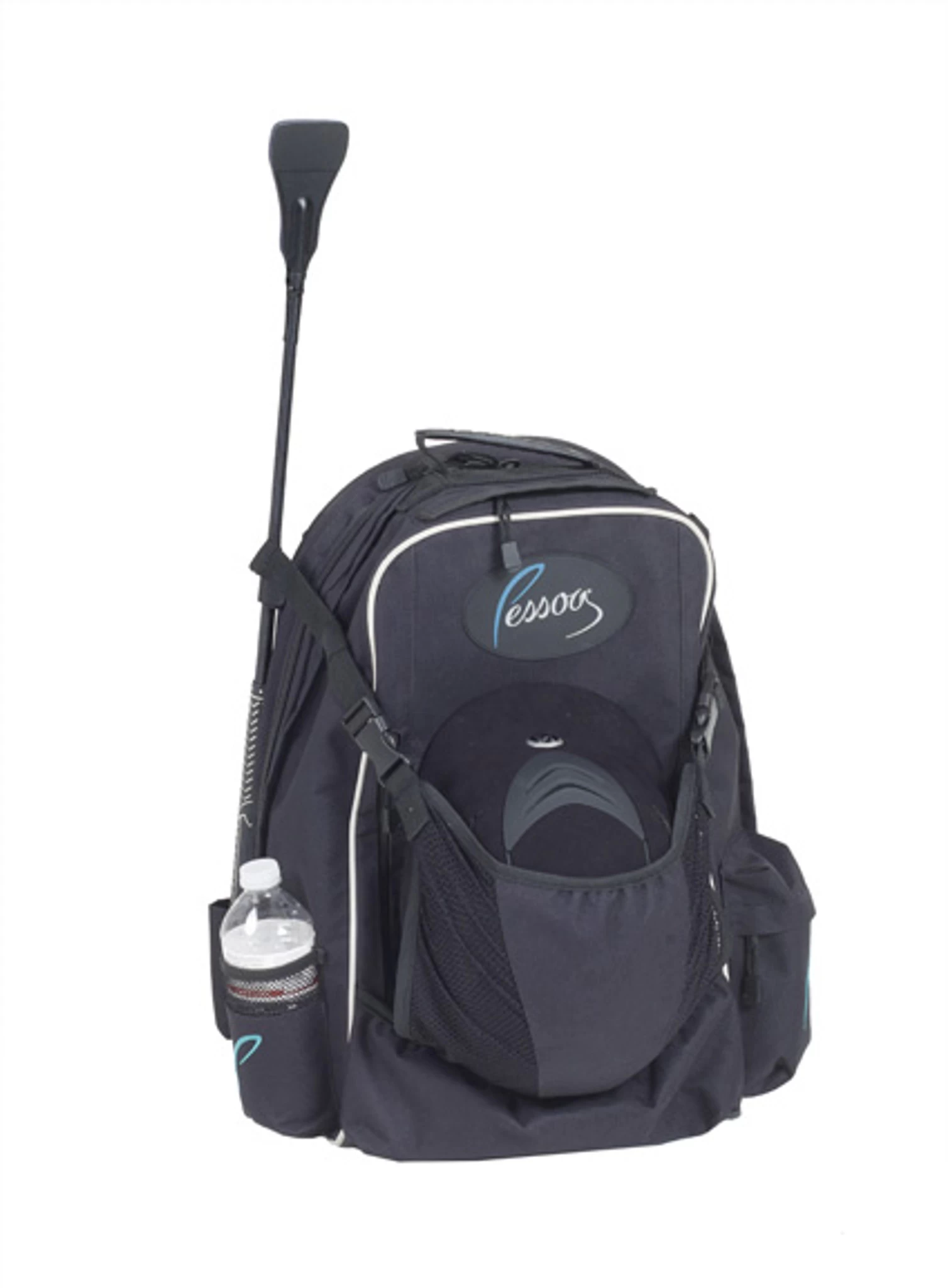 The Pessoa Show Backpack keeps all your gear handy ringside! Features a whip holder, water bottle pocket, helmet sling, and a roomy interior for all your show needs.