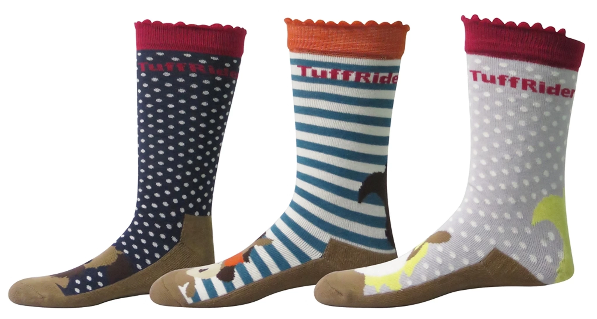 Every young equestrian will love these colorful horse riding socks! These paddock boot socks knit in a bamboo/cotton/nylon/spandex blend feature a cushioned sole, reinforced toe, and stretch opening. Sold in a pack of 3 pairs.