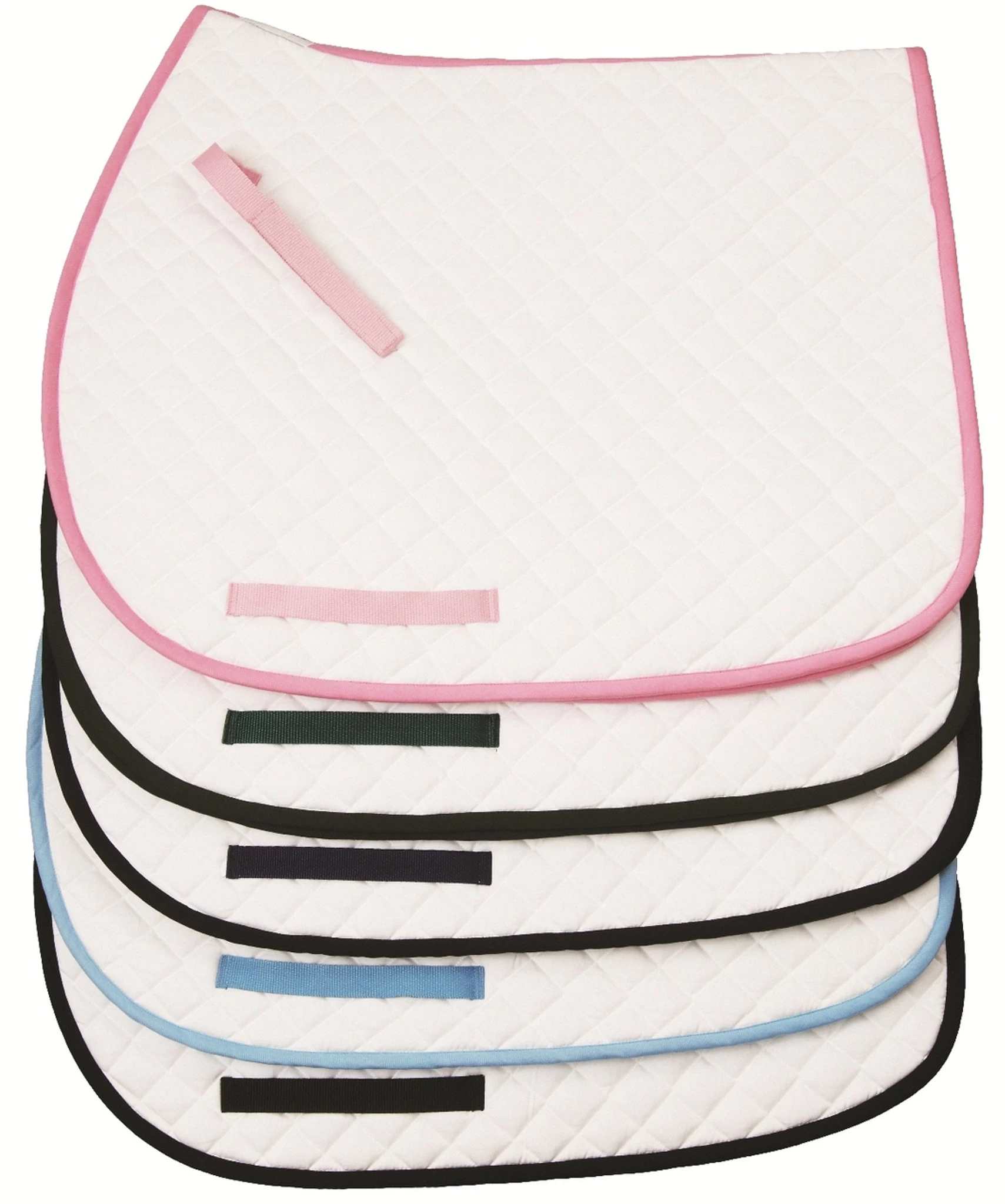 A quality white saddle pad at a great price. The perfect all purpose saddle pad with a poly/cotton top and a cotton flannel underside, diamond quilting, attractive trim, and Velcro billet straps. 22″ along the spine, 20″ drop.