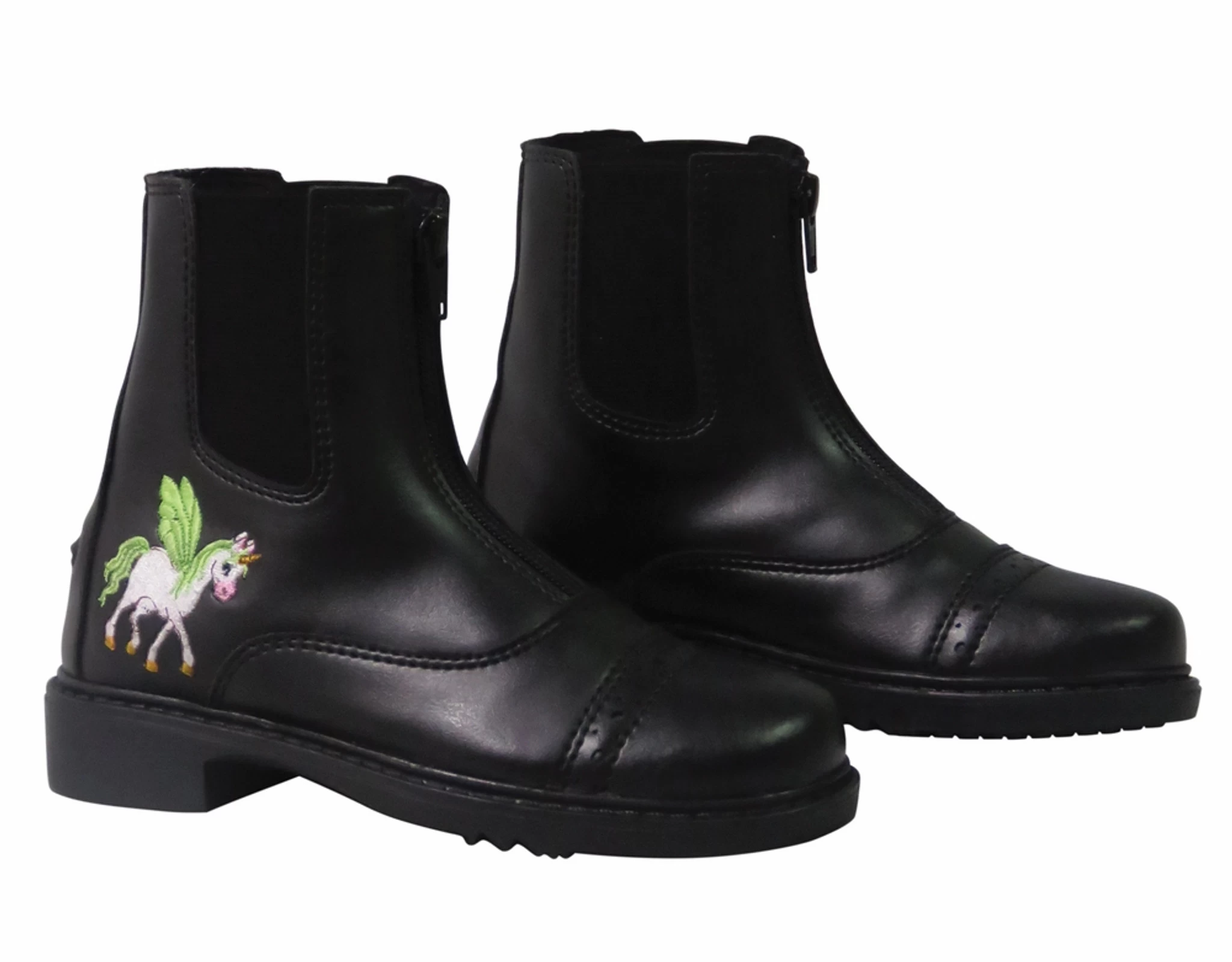 TuffRider’s cutest schooling paddock boot, the Children’s Unicorn Starter Front Zip Paddock Boots are made for the most magical little riders! Based on the best-selling, TuffRider Starter Front Zip Boots, features include elastic side gussets for comfort and fit and a rounded punched toe cap. The synthetic leather exterior and rubber sole ensure that these boots are water-resistant. Cleaning your new boots will be easy – just wipe with a damp cloth.
