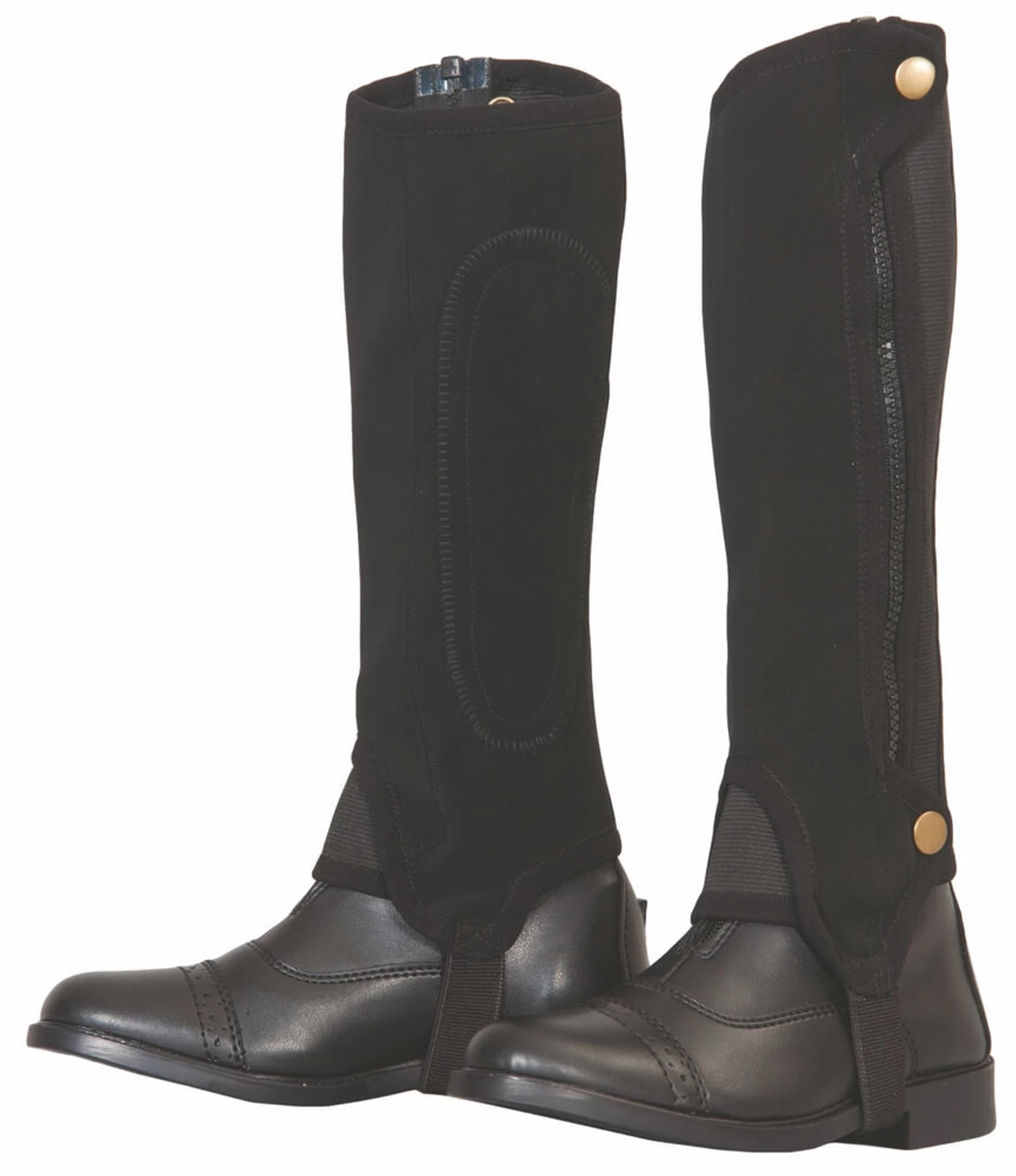 These popular kid’s half chaps offer the ultimate in comfort. Features include a high cut profile, close contour elasticized leg, side zipper, and reinforced inner leg. Snap closures are located at the top and bottom. Fully machine washable.