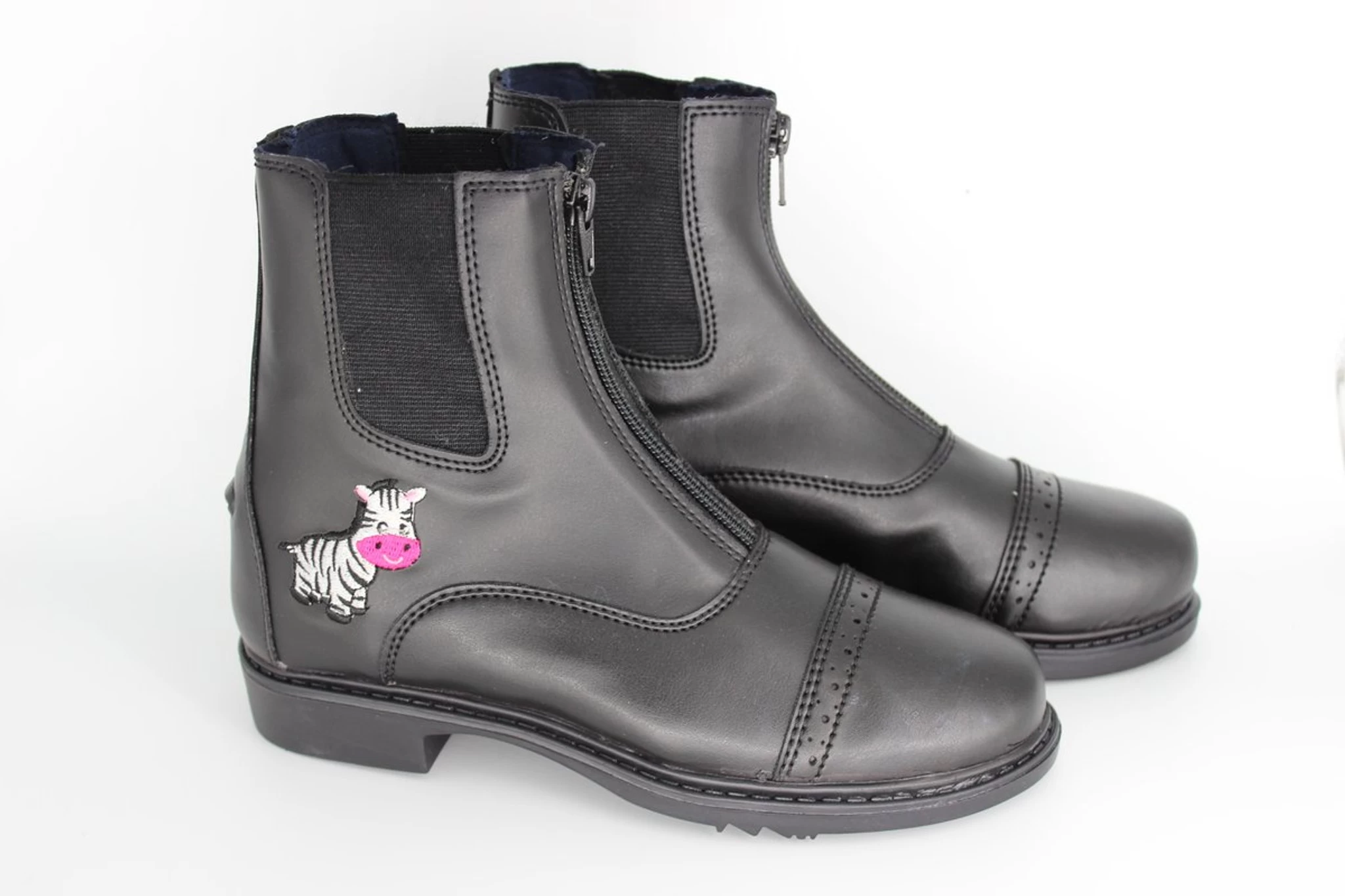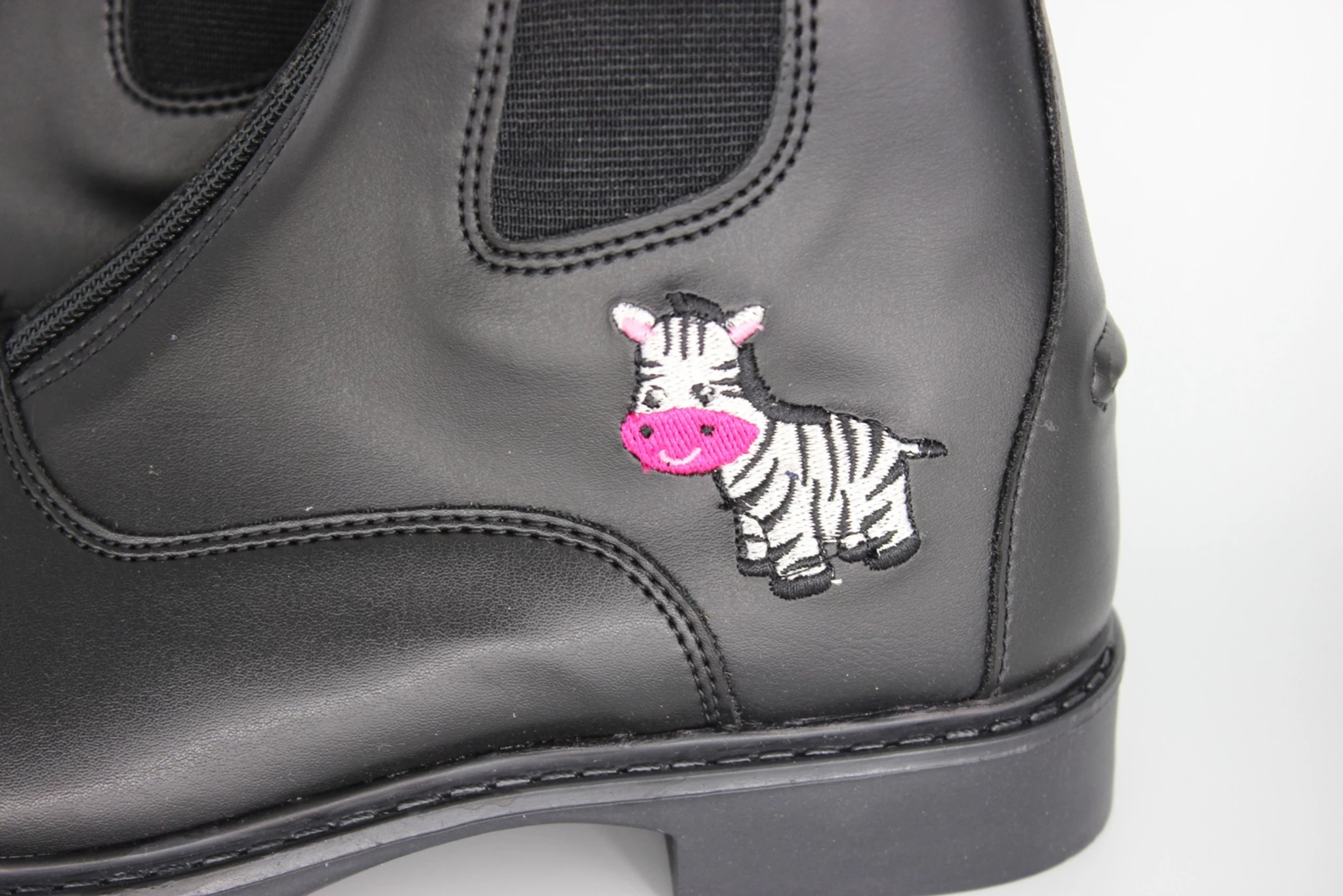The popular Starter Front Zip Paddock Boots with an adorable twist! The TuffRider Children’s Zebra Starter Front Zip Paddock Boots come with the same great features like the side elastic gusset for ankle flexion, classic punched toe cap and durable zipper. A whimsical zebra-embroidered detail is perfect for summer pony camps or lesson programs. A synthetic leather exterior and rubber outsole ensures water resistance and durability.