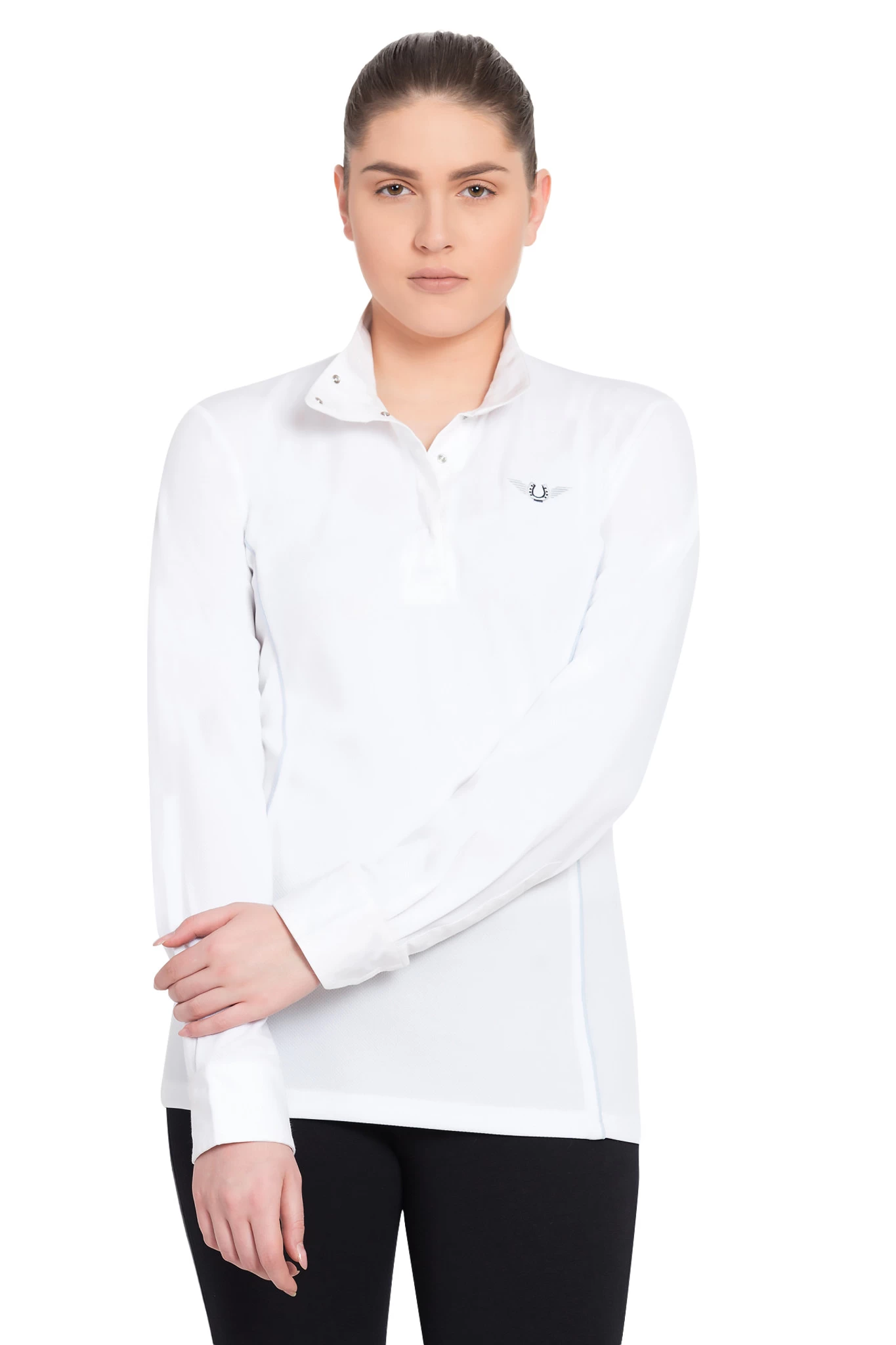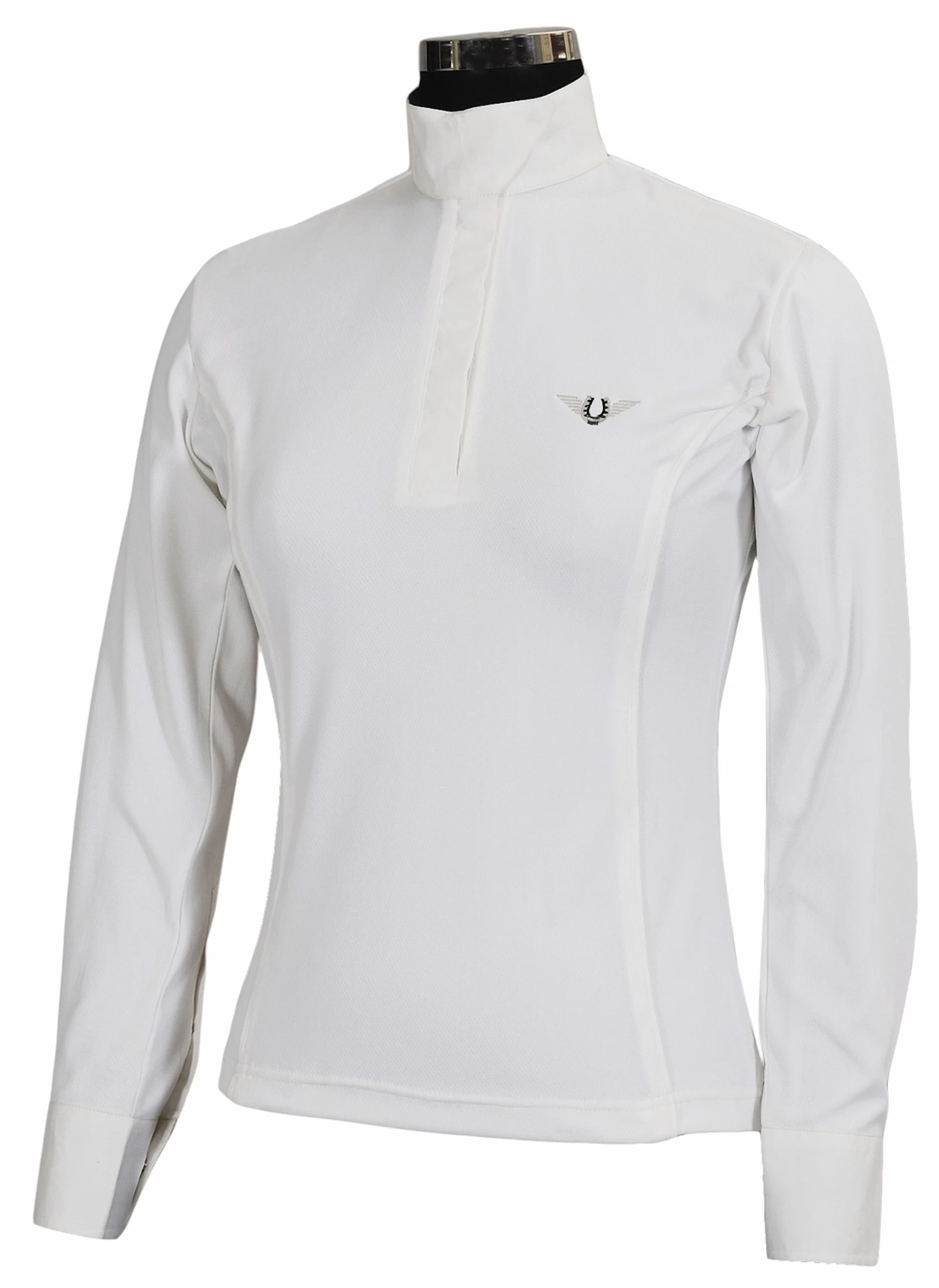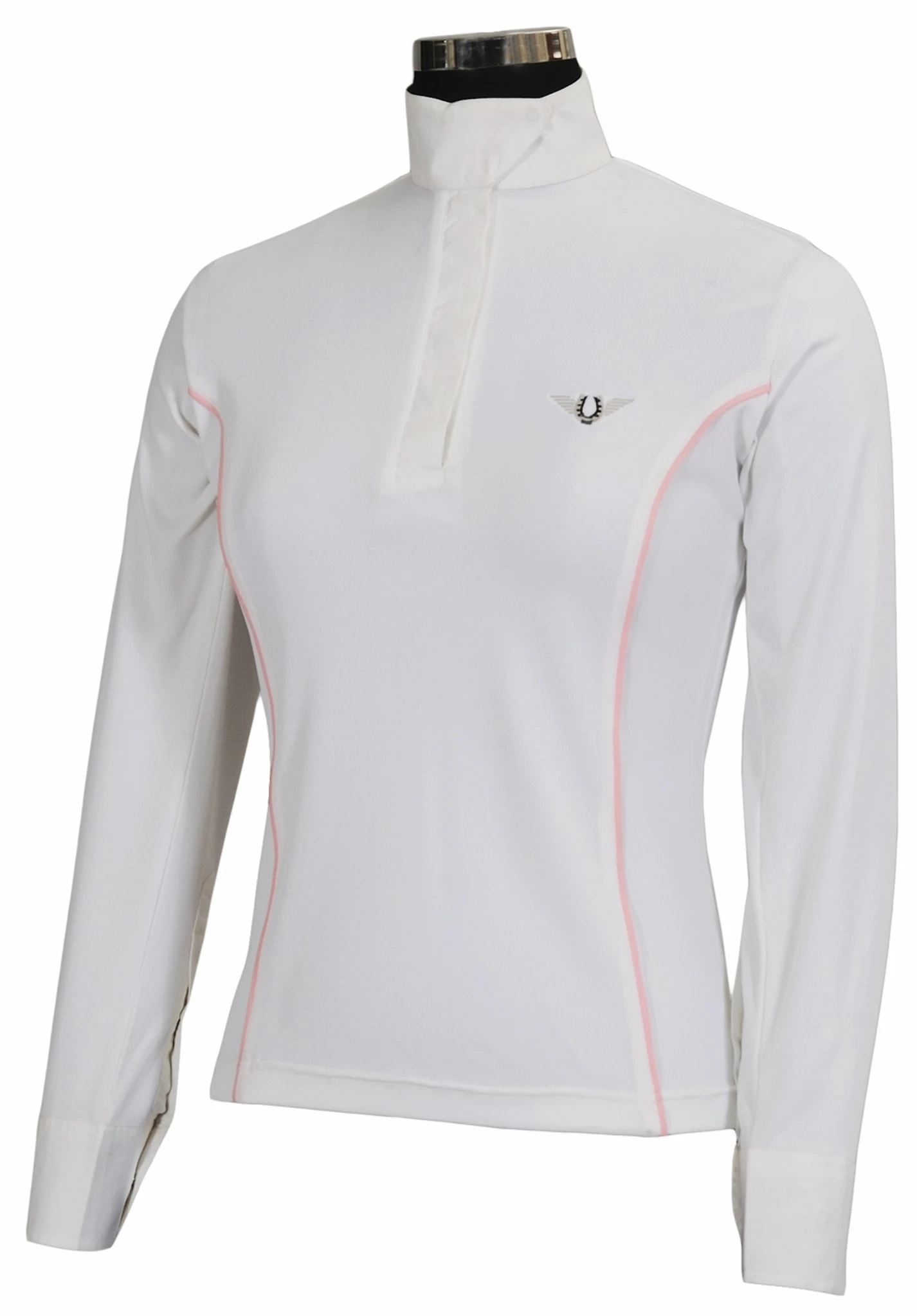 This lightweight show shirt is made with a moisture management fabric and will keep you cool, comfortable, and looking your best on show days. Contrast piping that follows a princess seam line on the front adds a pop of color and a flattering fit. A crisp, woven wrap collar ensures a clean look under your show coat.