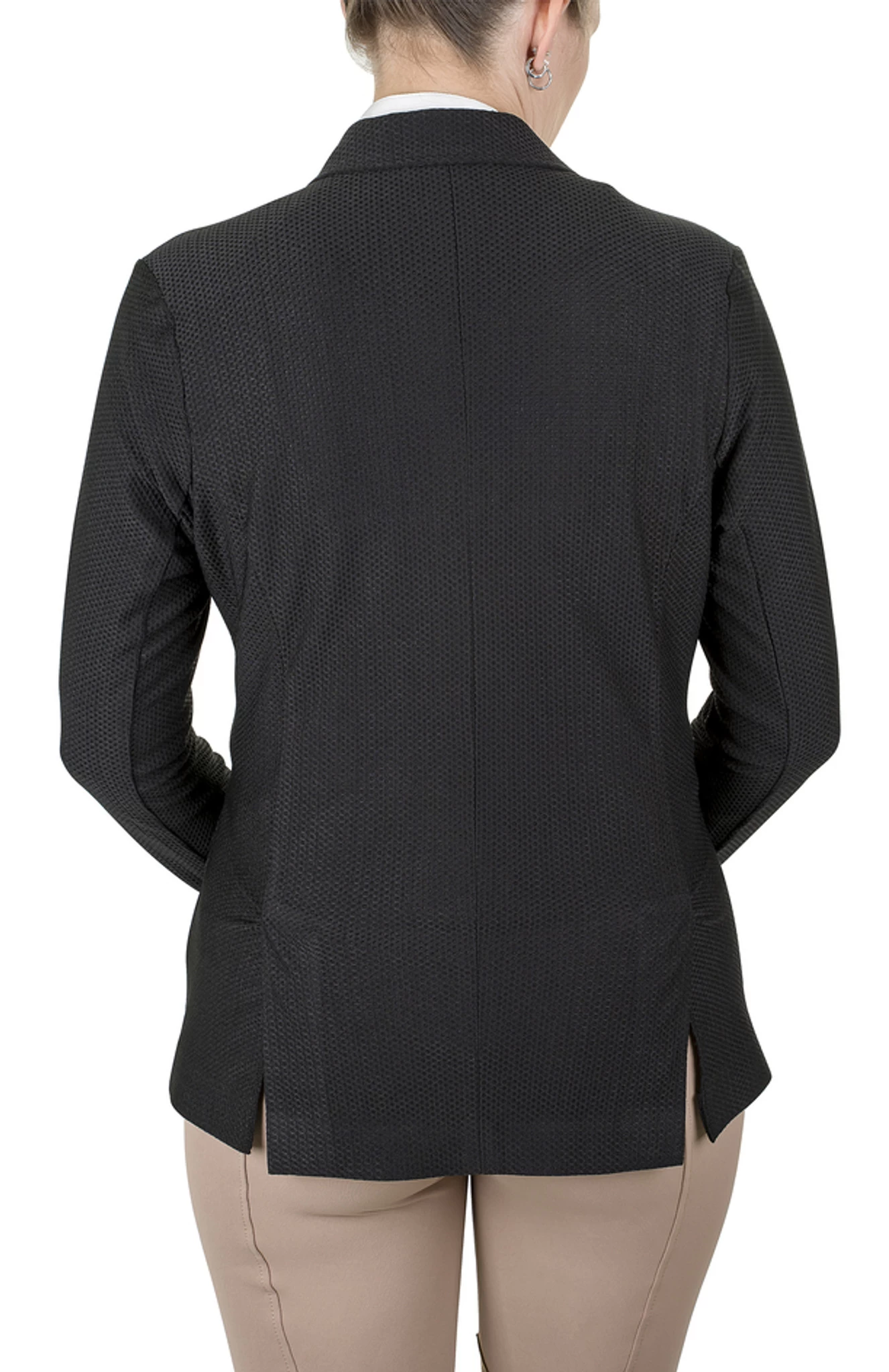 The Equine Couture Ladies EquiVent Show Coat is the answer to staying calm cool and collected on show day. Lightweight mesh material allows for total airflow, while ensuring an opaque, traditional look. Waffle-like mesh wicks sweat from the skin to aid in moisture control. A hidden zipper with 4 snap buttons makes for effortless on/off. Flattering princess stitching and a shape that flares away from the body enhances your natural curves for a flawless look in the show ring. Achieving that traditional, sleek look doesn’t mean sacrificing technical features.