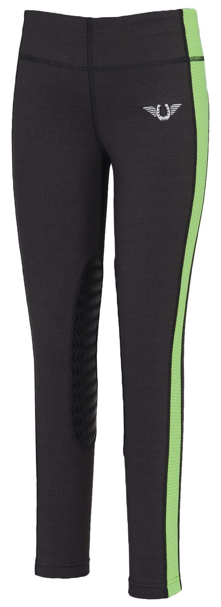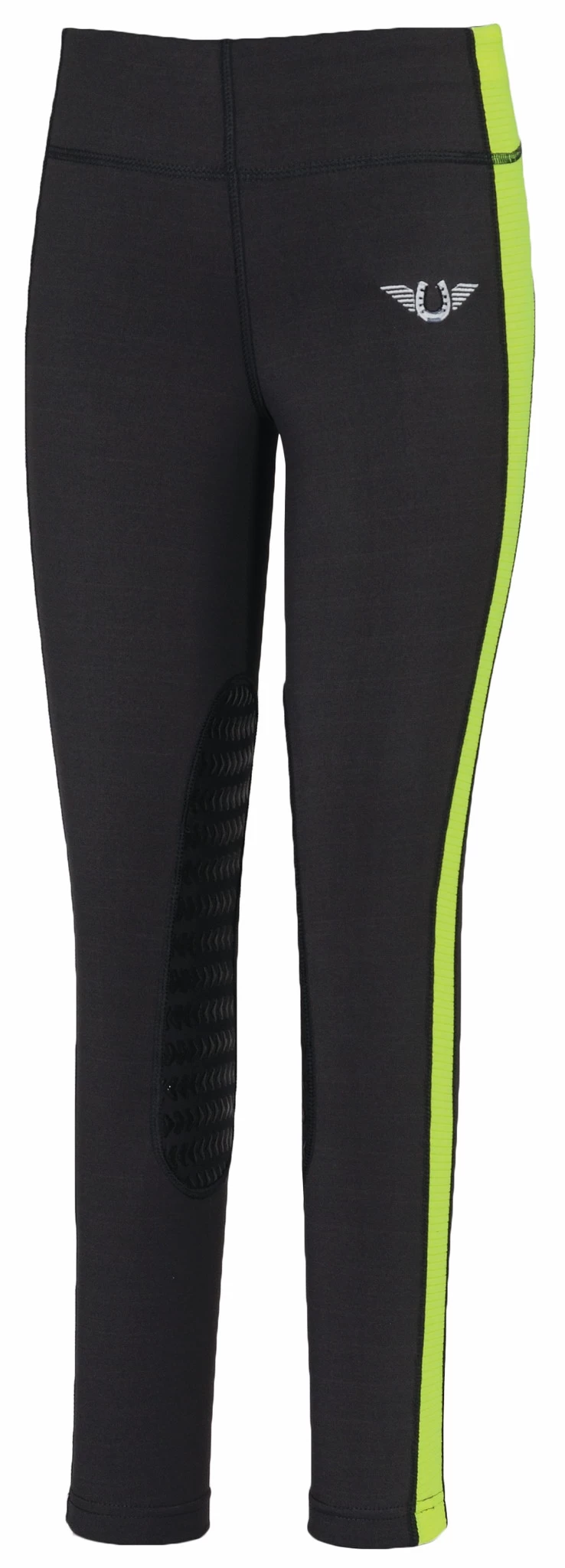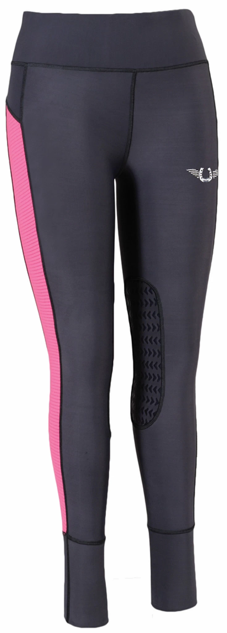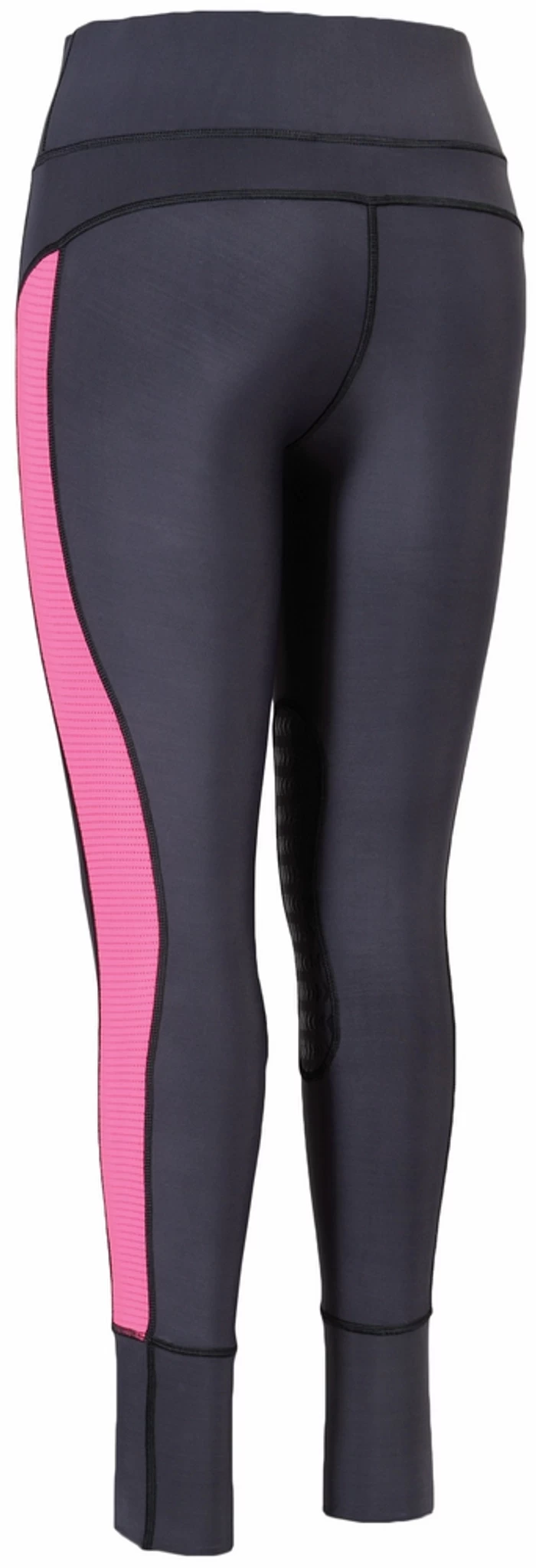 Designed for comfort, support, and style, the TuffRider Marathon Tights are sure to be a staple in your schooling wardrobe. With durable dynamic stretch material and breathable, moisture-wicking fabric, these pull on breeches offer convenience and support. Features colorful, ventilated material down the leg as well as a wide waistband and grippy silicone knee patches.