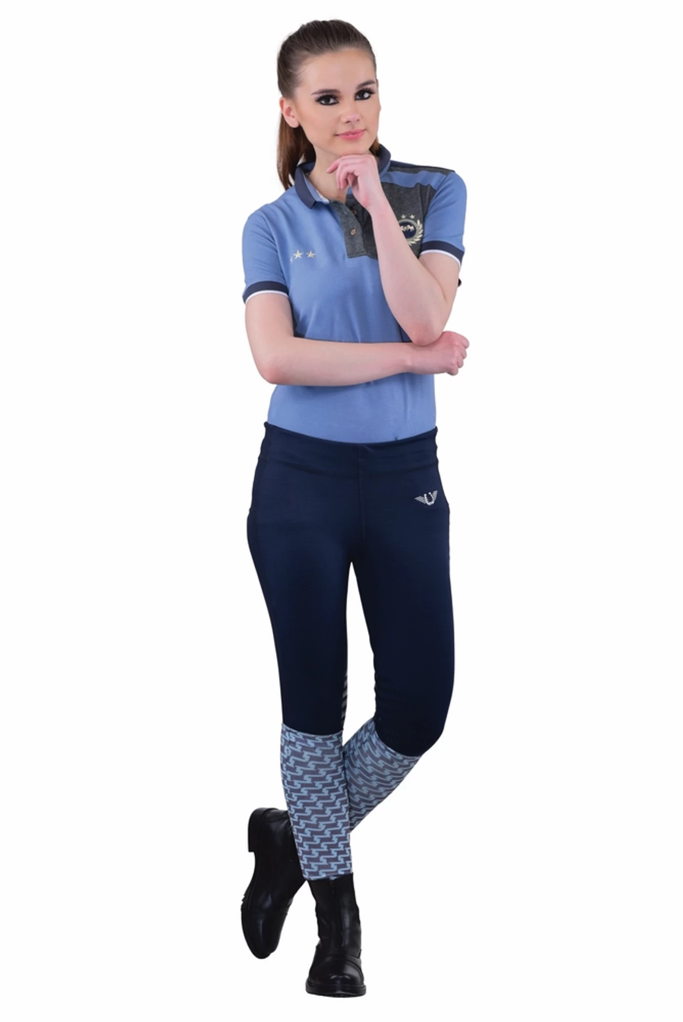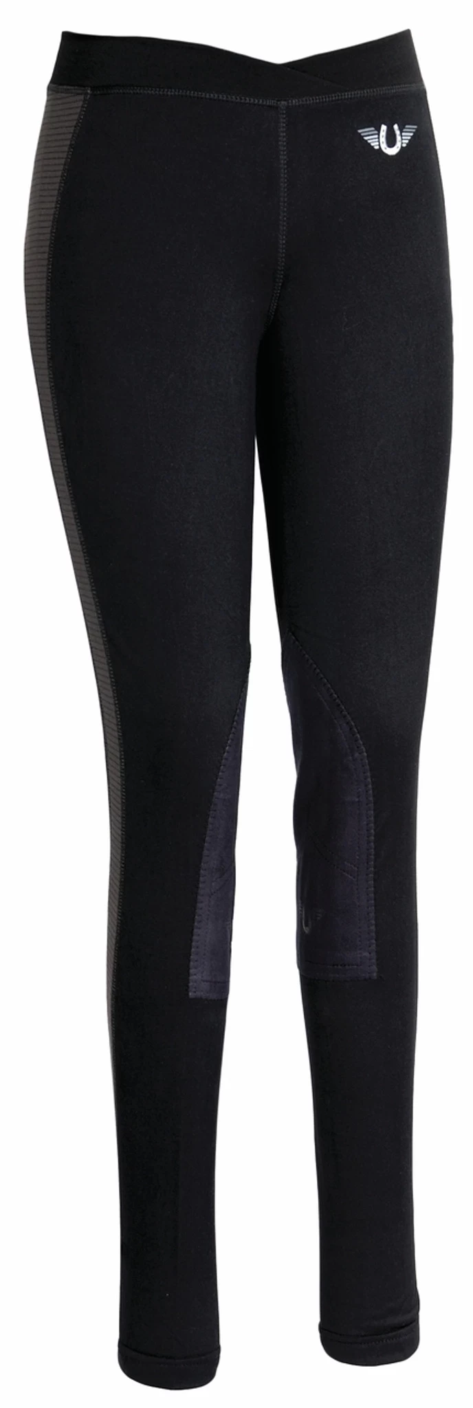Lightweight, ventilated, pull on, schooling tights are breathable and feature a low-rise stretch waistband. Contrast striping is made with a ventilated, moisture wicking fabric, and continues up the leg and across the back for maximum comfort on those steamy days. The inset silicone knee patches help keep you securely in the saddle.