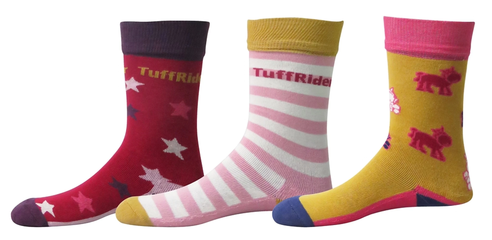 Every young equestrian will love these colorful horse riding socks! These paddock boot socks knit in a bamboo/cotton/nylon/spandex blend feature a cushioned sole, reinforced toe, and stretch opening. Sold in a pack of 3 pairs.