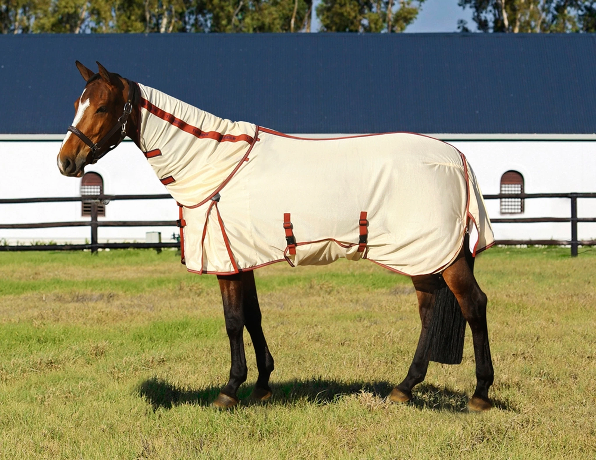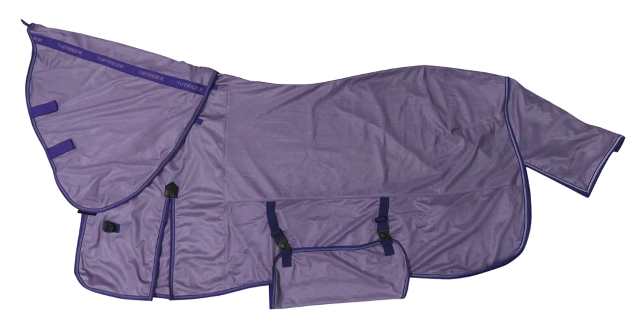 Give your horse more insect protection with this detachable-neck fly sheet. Clozease buckles on the neck and body provide easy on and off. Traditional side gussets allow unrestricted shoulder motion and help protect against rubs. A nylon lining at the shoulders further reduces the possibility of rubs, while offering reinforcement to reduce stretching. The adjustable and removable belly band fully covers the horse’s belly to give complete protection from biting insects in this sensitive area, and it’s removable for easy washing. Adjustable, removable web/elastic leg straps move and stretch with the horse to ensure comfort and fit.