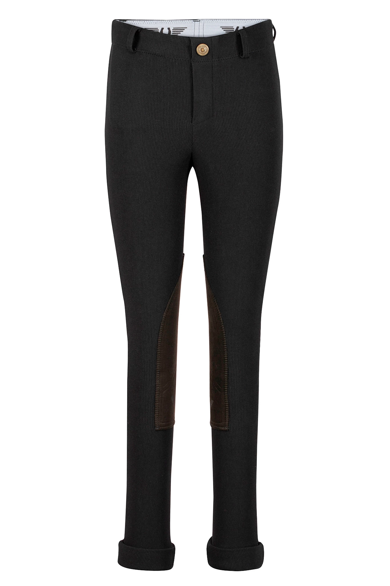 TuffRider® pull on jodhpurs offer a modern fit for your young equestrian with a low rise that sits 1” lower on the waist. These kids riding pants also feature a regular width waistband, false fly, belt loops, UltraGripp knee patches, and elastic boot straps to hold the pants down over the paddock boots. The ribbed fabric is durable, minimizes pilling, and ensures a perfect and comfortable fit. Machine wash and dry.